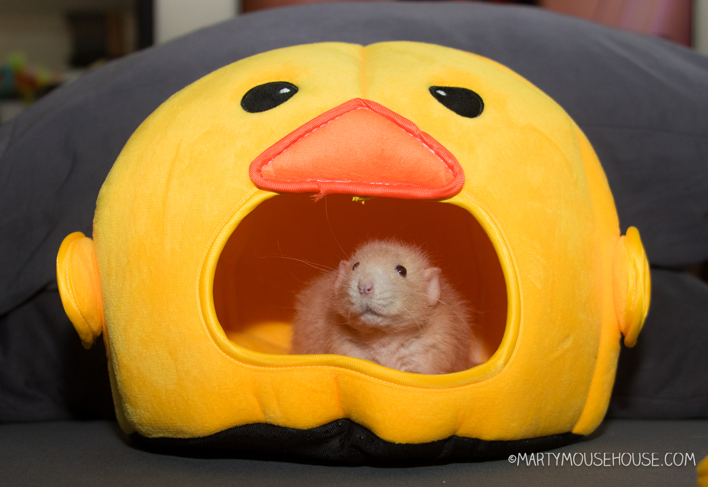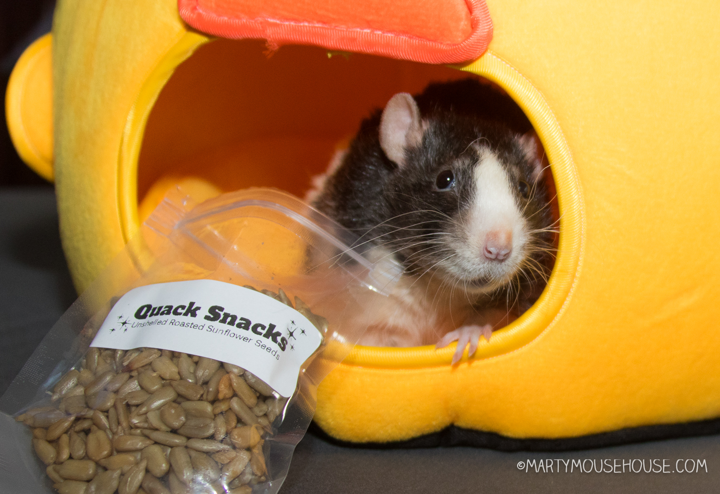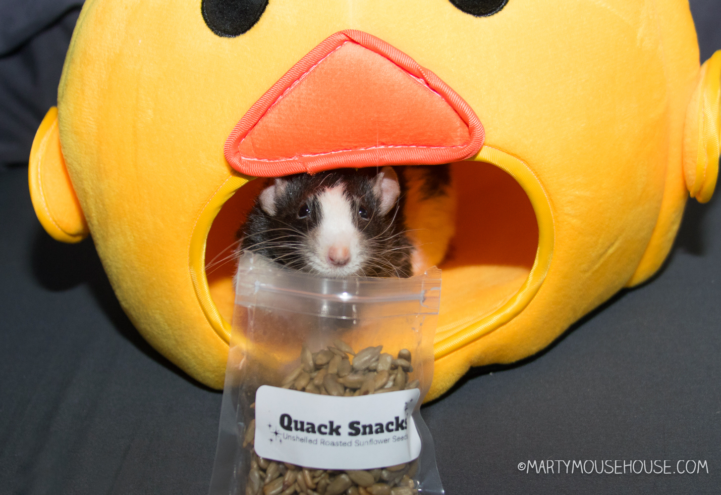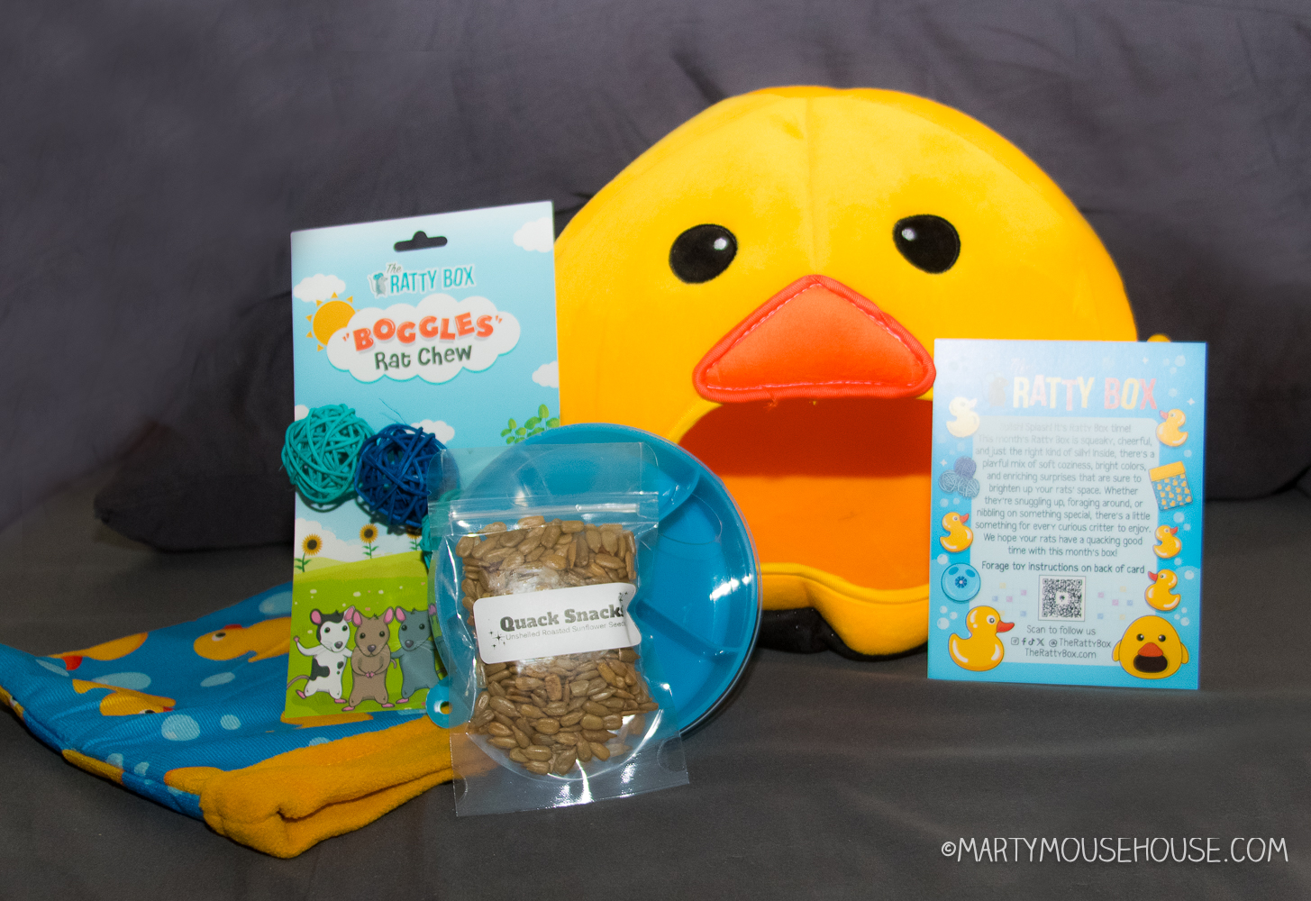 We hab been a little down, but this morning we got to play wiff our new ducky stuff from the Ratty Box and it was a lot ob fun! The big duck is super comfy, and the little duck sack was perfect for Fish to snuggle in. I ate some ob the quack snacks before they eben got put in the forage wheel, I know it was cheating, but just a little bit. I fink it’s ok. In the spirit ob the box, mom told us some jokes that really quacked us up. Mom finks her jokes are berry funny, but not all ob them make us laugh, but we laughed anyway. Fank you Ratty Box for lifting our spirits dis morning!
