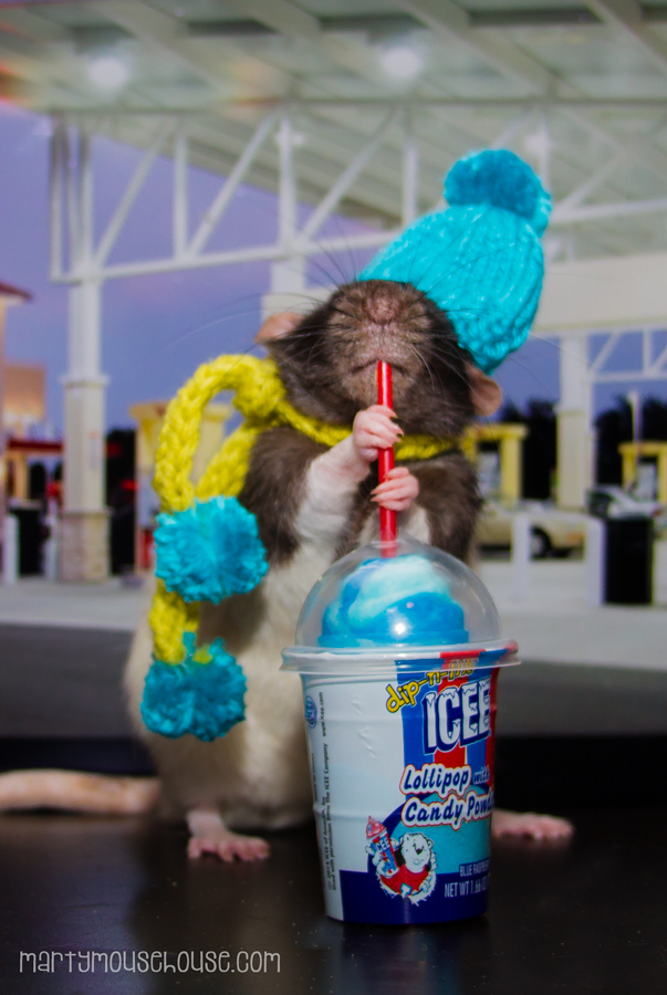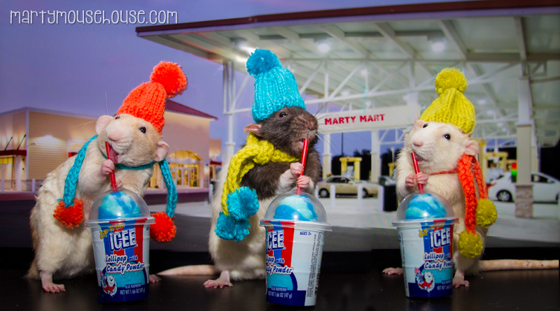 We hab been campaigming here in New Hamster dis week, and when Wimbley told us about dis Icee fing he had, we had to find the nearest Marty Mart and try it!   It’s really cold here, and the icee fing is cold too, but it was so good!   It’s so busy talking to all the peoples and answering all dese qwestshuns but it’s fun and eberybody lubs the donut truck we hab wiff us.   We hab so many donuts, if you see our bus around town, wabe at us and we’ll stop and gib you one!