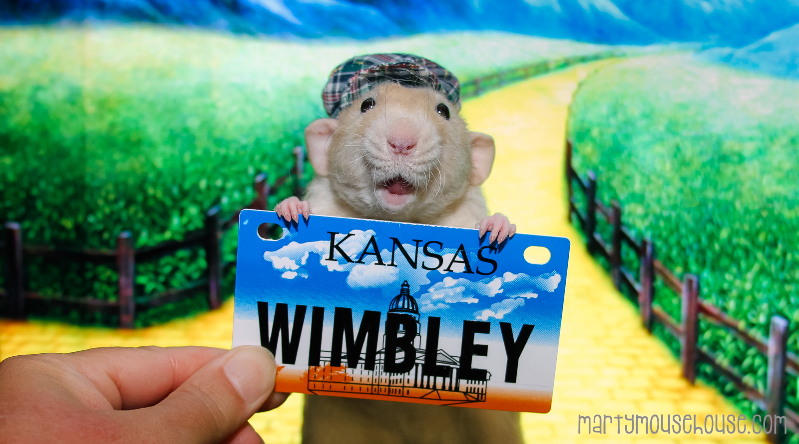 Soooo…. our trabels brought us to Kamsas!  Shirley hooked us wiff bizness, and it was berry exciting.    We started out on a quiet Kamsas farm, wiff a few farmhands.   Then the weather took a turn and a storm came up.  A nasty old woman  chased us wiff a broom during a tornado.  When we woke up we were on the yellow brick road!   Little voices told us to follow it.   So we did.   A big pink fairy appeared in a bubble and told us to go see a big green Wizard, but we hab been away from home for a long time, so we took a little walk on the yellow road,  then we went home.   The wizard sounded a bit scary, plus we heard about the flying monkeys.  No, fank you.