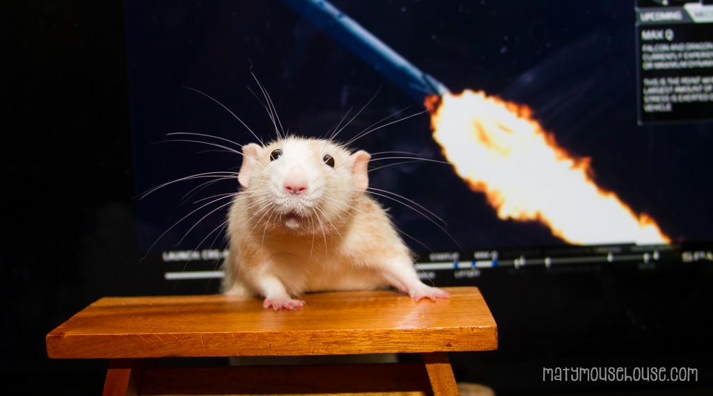 Hai eberyone! Dis Milo, your science correspondamt. Did you see it today!?? Our friends at Space-X just landed da first stage of dere Falcom 9 rocket on a platform in da ocean so they can reuse it again after launching the Dwagon spaceship up to the Space Station in orbit! Do you know how hard dat is?! Dats like frowing a pencil ober da Empire State Building and landing it on its ewaser on da other side. Pwetty cool! Ob course, we already hab a reusable spaceship here at the Marty Mouse Space Program, but you hab to start somewhere. Lots of yogies for my friend Elom Musks today! We watched it here, it was berry tense – but berry exciting!!