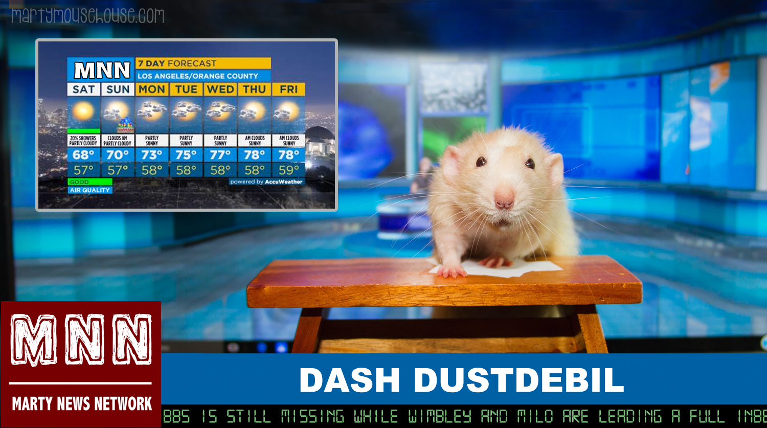 Hai. Dis is Dash Dustdebil filling in for the Fibbs Frost Friday Forecast. Fibbs is still missing but Milo and Wimbley are out searching. Residents in the nearby area are sending in tips and we are checking dem all out. In other news, there is weather happening.