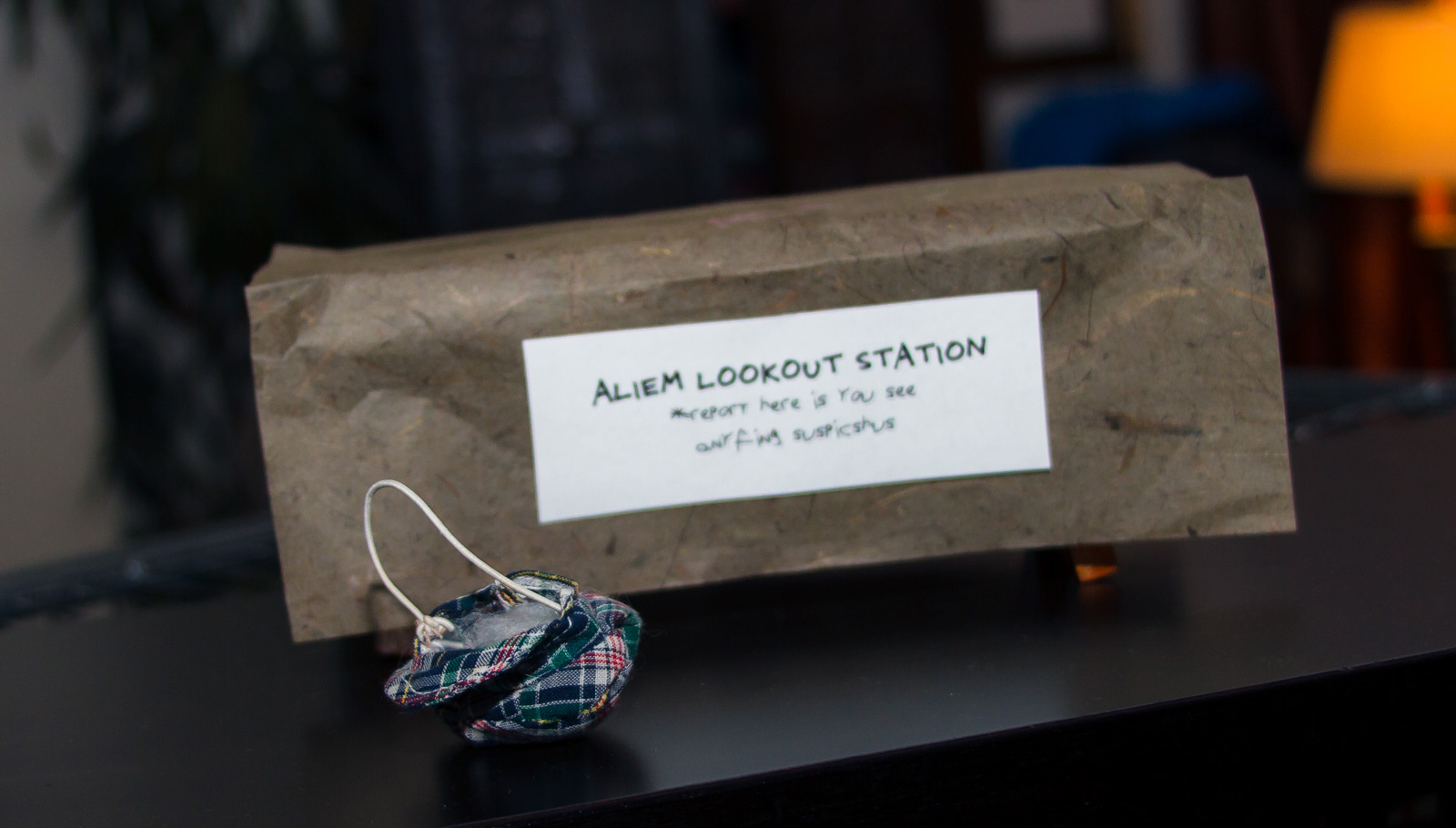 Hai, dis Fibbs. We heard noise and went to check on Wimbley – he’s gone! We checked the bideo monitor and saw dis bideo, and all we found was his trabel hat left behind! I know he was excited to meet the aliems, but didn’t fink dis would happen….