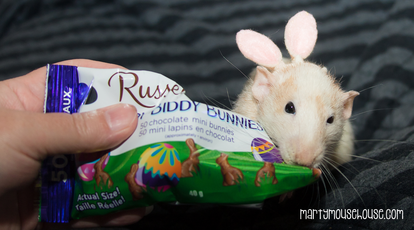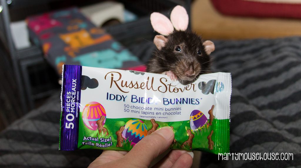 We got an Easter present from our friend Oliber and his sisters – it’s a whole bag ob Iddy Biddy Chocolate Bunnies!! When I eat them I like to start wiff the ears first, they are the tastiest part. Fanks to Olibers mom Daisy for helping him get these to the magic box to send, I hear Oliber doesn’t dribe.