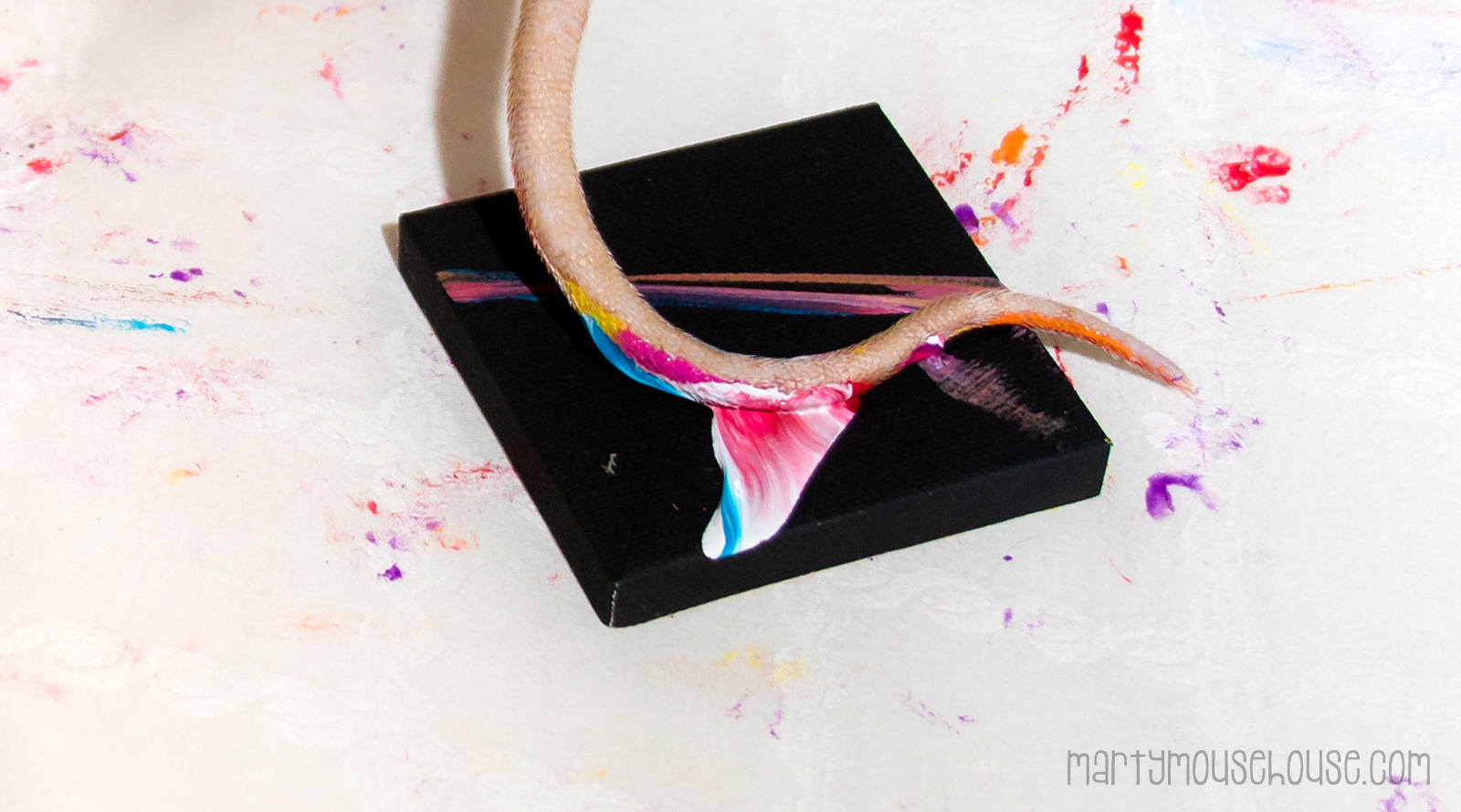 Earlier dis week we did more paintings More tail swishes, ball drags and hand print flowers wiff explosions ob color! Dis batch is really cool and we will share them wiff you soon. I really like the squishy feeling between my toes.  That is Milos tail in the photo.  P.S.  Dis Fibbs.