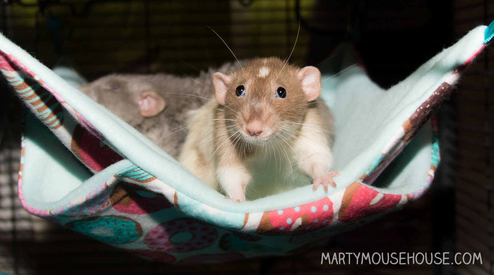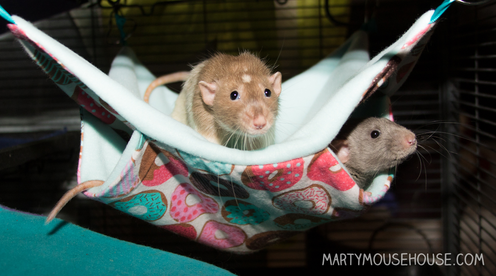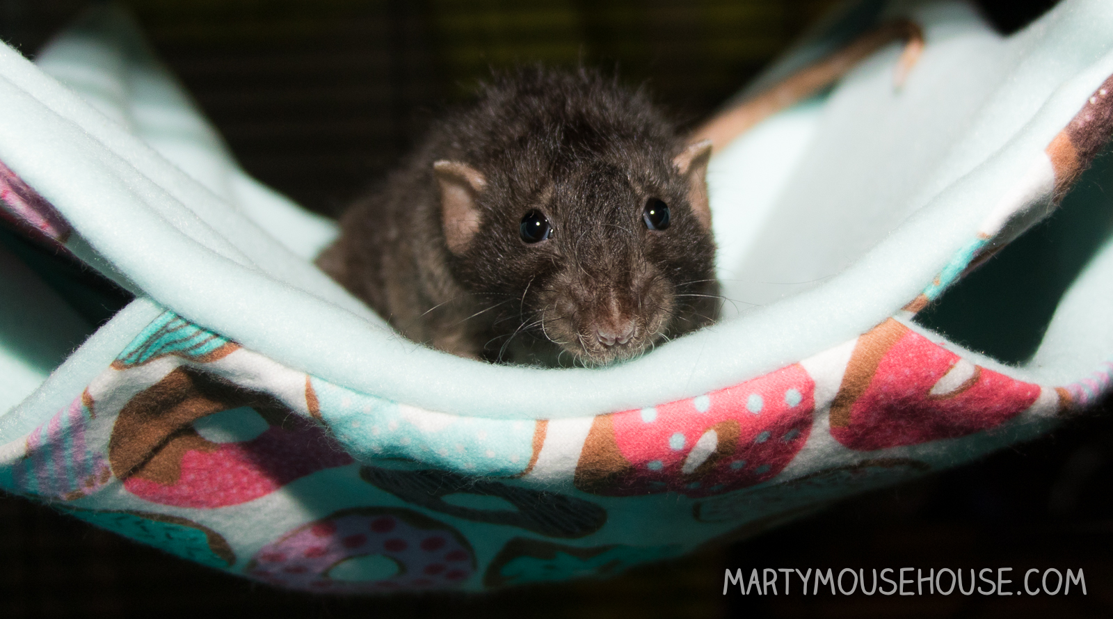 It’s almost our birffday (me and Cosmo) and we got a present!!  A donut hammock!!  It was for Bean too.  All ob us can share.  Its berry comfy and warm.  Fank you for starting our birffday off on a good note Anna from Simply Ratty!