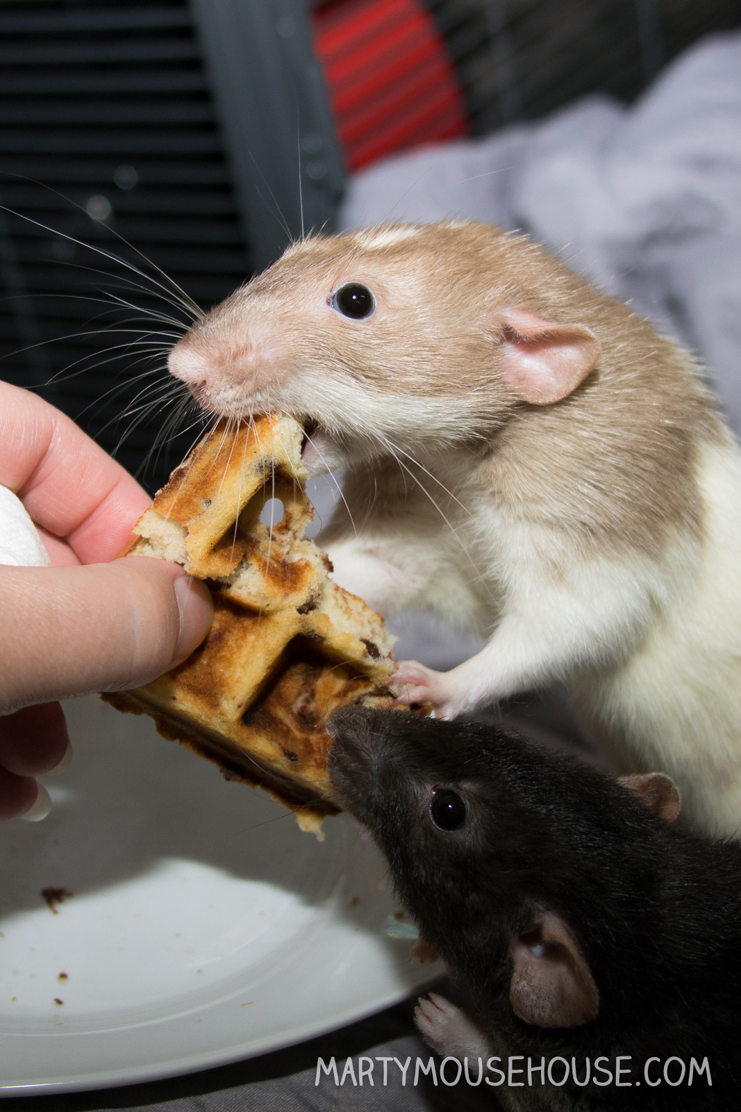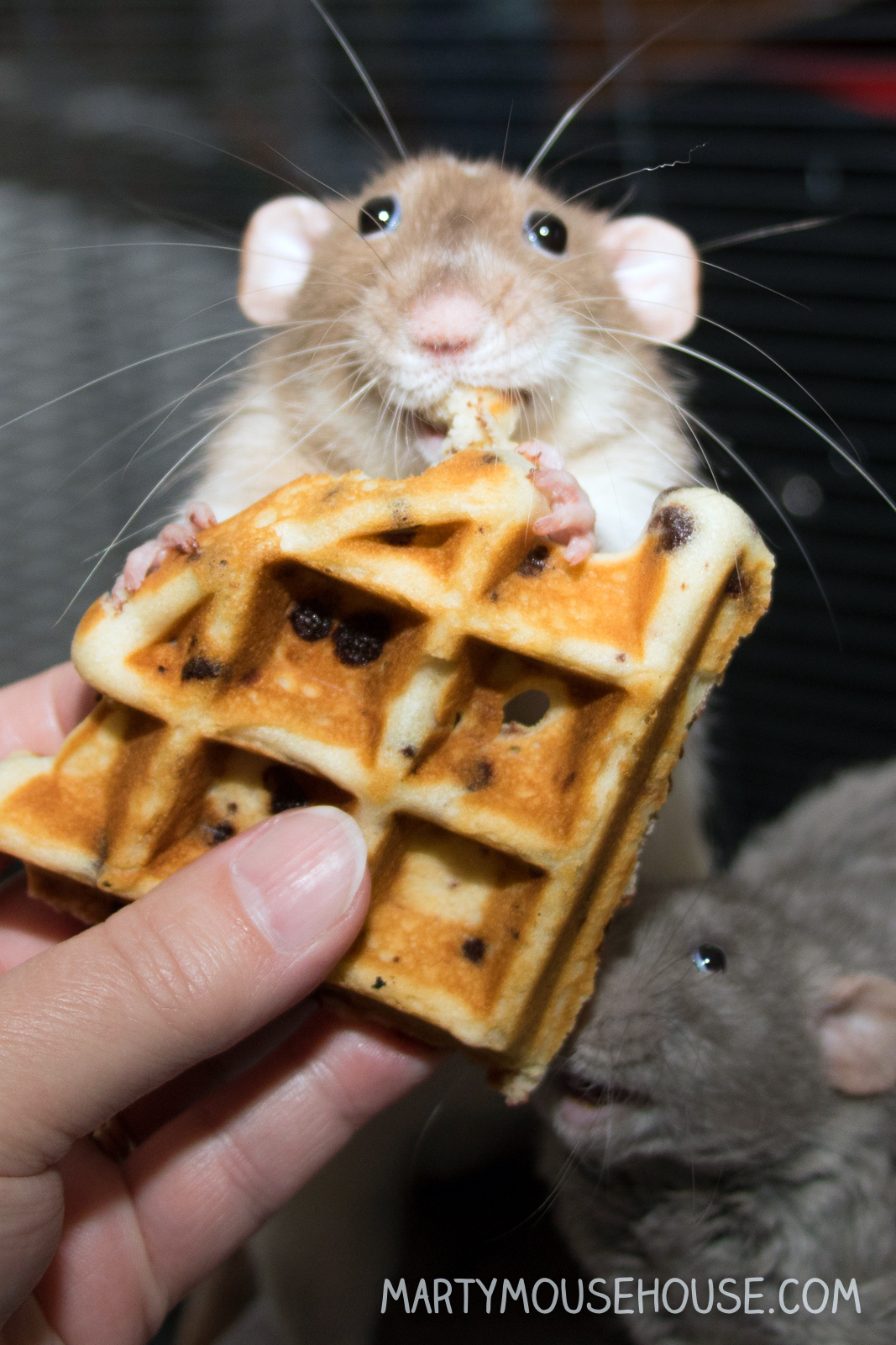 Wonderful brown crisp waffles for three terrific handsome ratties.