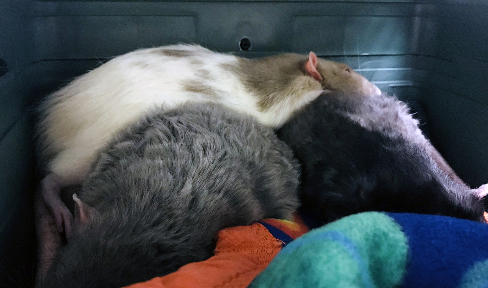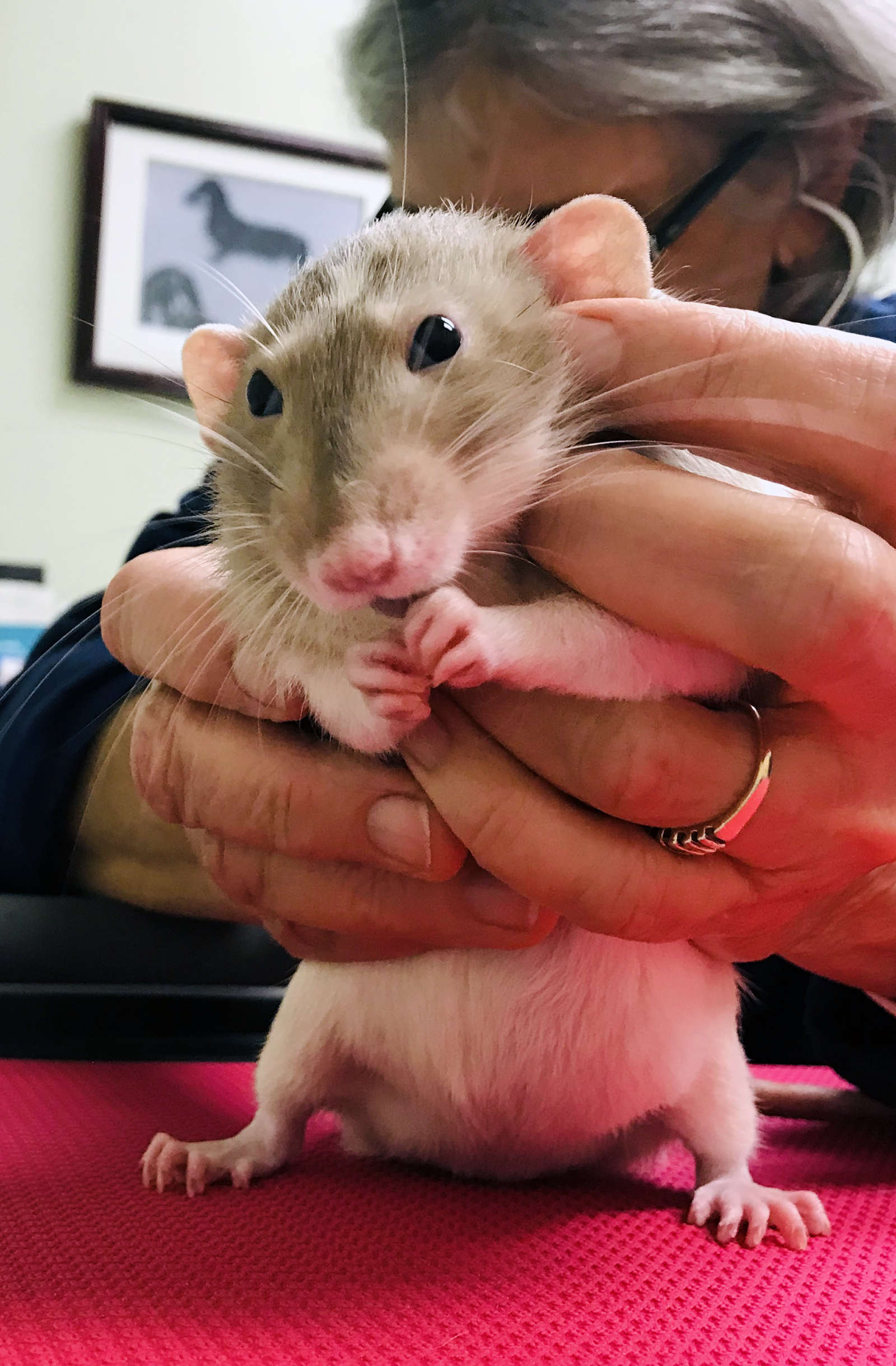Dis MM.  As many of you know sometimes our little ratties like to surprise us with medical emergencies, and this weekend, it was Cosmo that decided to divert our weekend plans.  He was a little lethargic Sunday morning and I had no idea what was wrong – everything seemed ok the day before – plenty of energy and fighting for sketti.  So we rushed him to the vet (thankfully open on Sunday) and after an x-ray he was diagnosed with pneumonia.  He received some sub-Q fluid, was prescribed three meds, and will get the best care.  Already today he seems to be a bit perkier and feeling better.  He gab me a big scare!