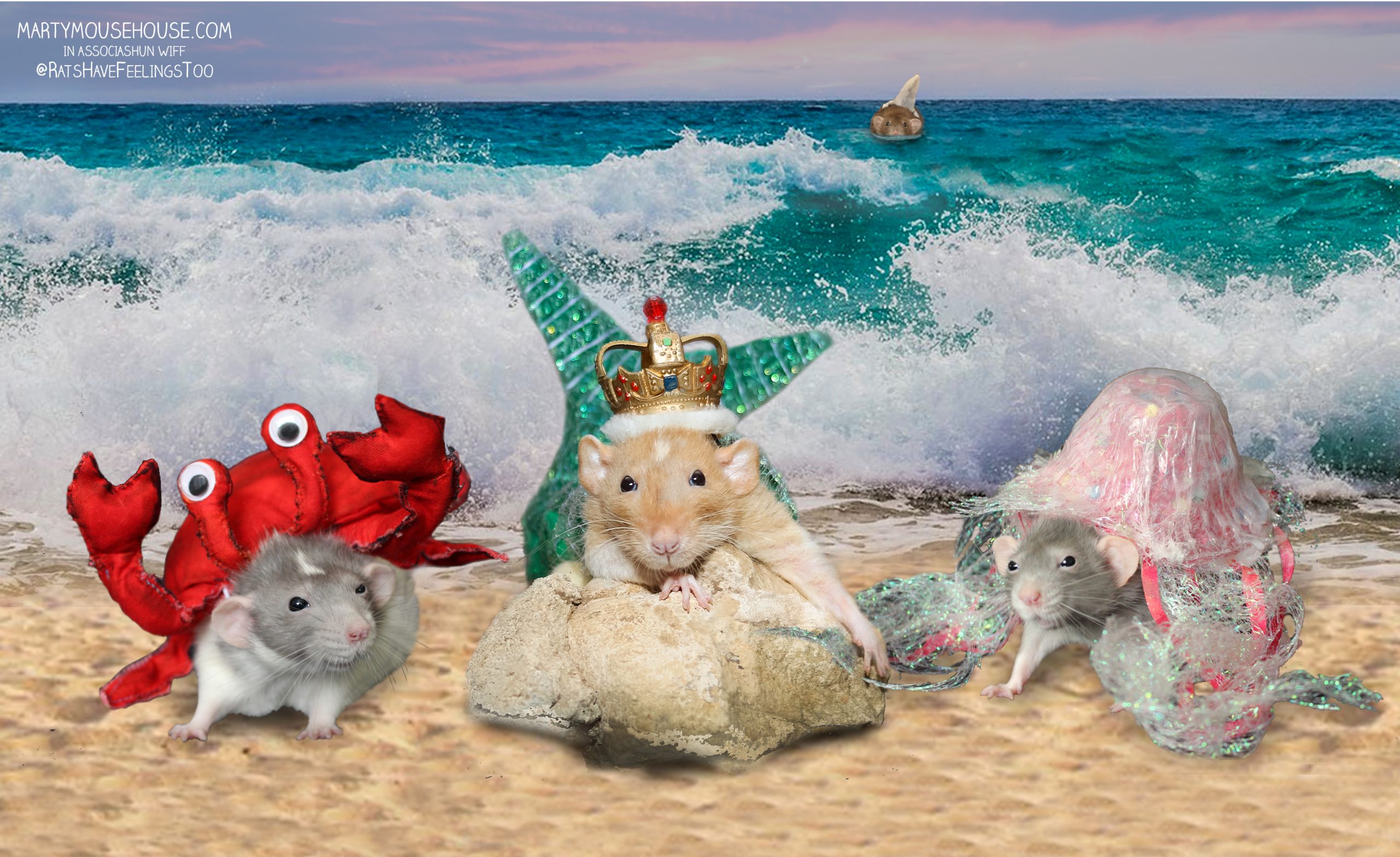 Happy Halloweem eberybody!! Dis Bean, the MerKing, and I am spending the day at the beach wiff the ladies ob @RatsHaveFeelingsToo (Mizu the crab, Heaven the jellyfish and Potato the omg….SHARK!!). We hab lots ob candy and an outdoor mobie screen to watch scary mobies when it gets dark. There are no mummys, bampires, or ghosts out here, which is good, because no one needs dat kind ob trouble. If you run into any zombies today, remember – 1. Cardio 2. DoubleTap. 3. Beware of baffrooms. It can be scary out there, so maybe you should just stay home and be safe. BUT if you get a scary call and it’s coming from inside the house, then you should run outside immediately. I guess it’s dicey either way, stay nimble and don’t go looking for trouble… just candy.