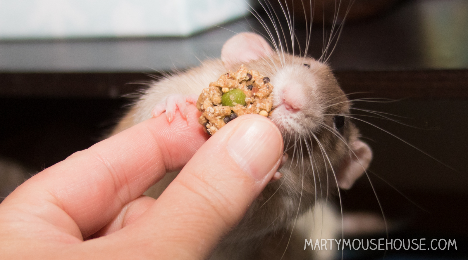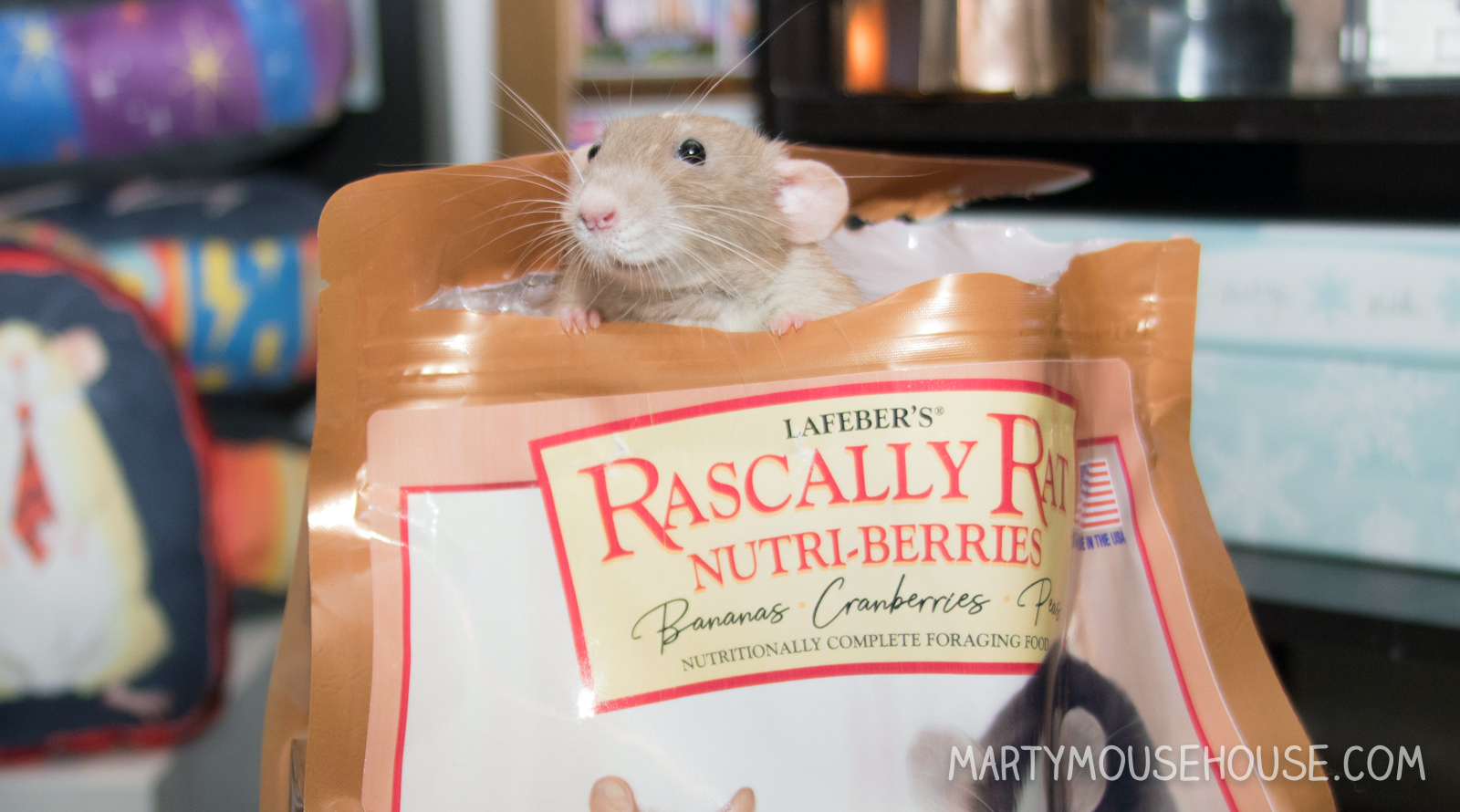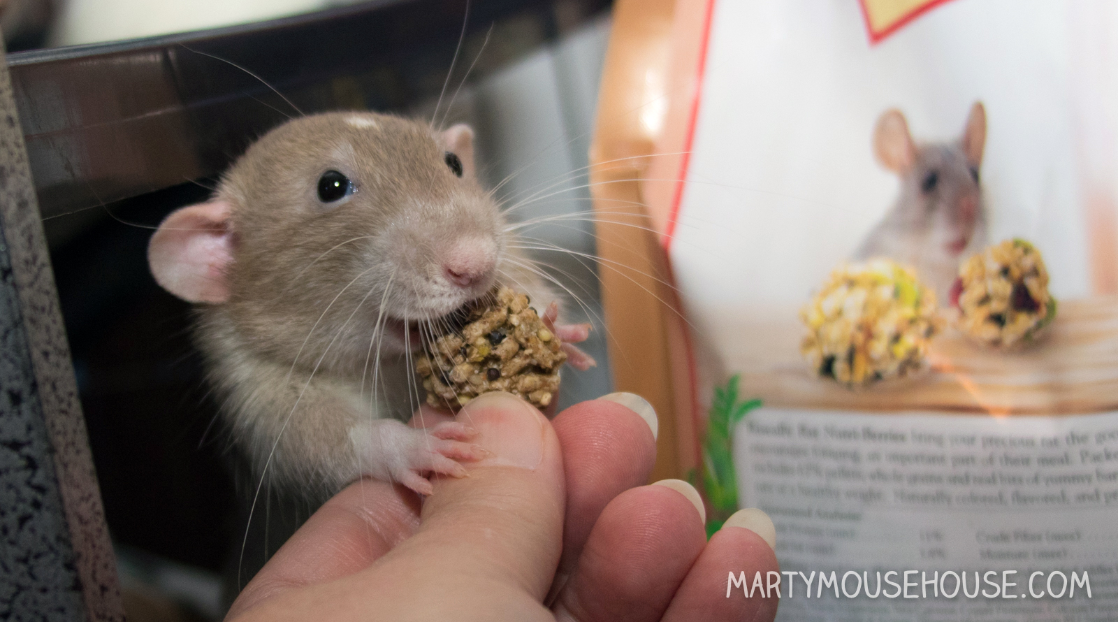 Social Media Influencing has became a big part ob Internashunal Bizness. Cosmo, Augie and Bean were really good influencers. So when Lafeber’s Rascally Rat Nutri-Berries (not related to twigs and berries) contacted us and asked if we wanted to try some, it seemed like a perfect opportunity. What’s in it we said? (It’s always important to understand your product). “Nanners, Cranberries and Peas and whole grains…” they said. “PEAS??!?” I said. YES!! You had me at peas.