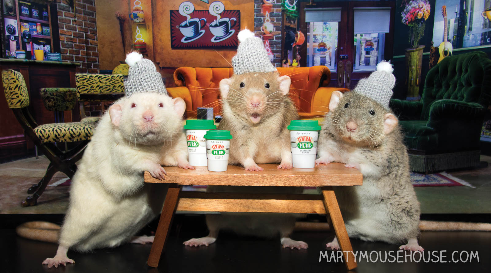 Oh hai, it’s me Nickels, and I’m here wiff Bert and Beez in the real life Central Perk!  Bert told us about it yesterday and we had to come right away.  He didn’t realize where he was, but I told him ob all the stories that happened here wiff Ross and Rachel, and Chandler and Joey and Phoebe and Monica.  It’s just like you would fink it was, and sometimes Joey still comes to get his coffee here. Me and Beez got a warm banilla, and Bert tried the Starberry Fraise this time.  Bert might do some more poetry, and I might debut my new musical talent.  I do some rapping under the name “Fibe Cent”.  New York is pretty cool, eben thought it’s pretty cold.  We hab our hats on but our toes get a little chilly on the sidewalks, but we won’t be here long because we hab to get back home to our birffday party.  We hab neber had a birffday party before, but it sounds like so much fun and there will be cake! I don’t know if it will be banilla cake, or chocolate cake, or coffee cake, or kale cake, and maybe we will get ice cream wiff it too.  But anyway, dis is a cool coffee shop and today we are not only brothers, but we are also F•R•I•E•N•D•S!