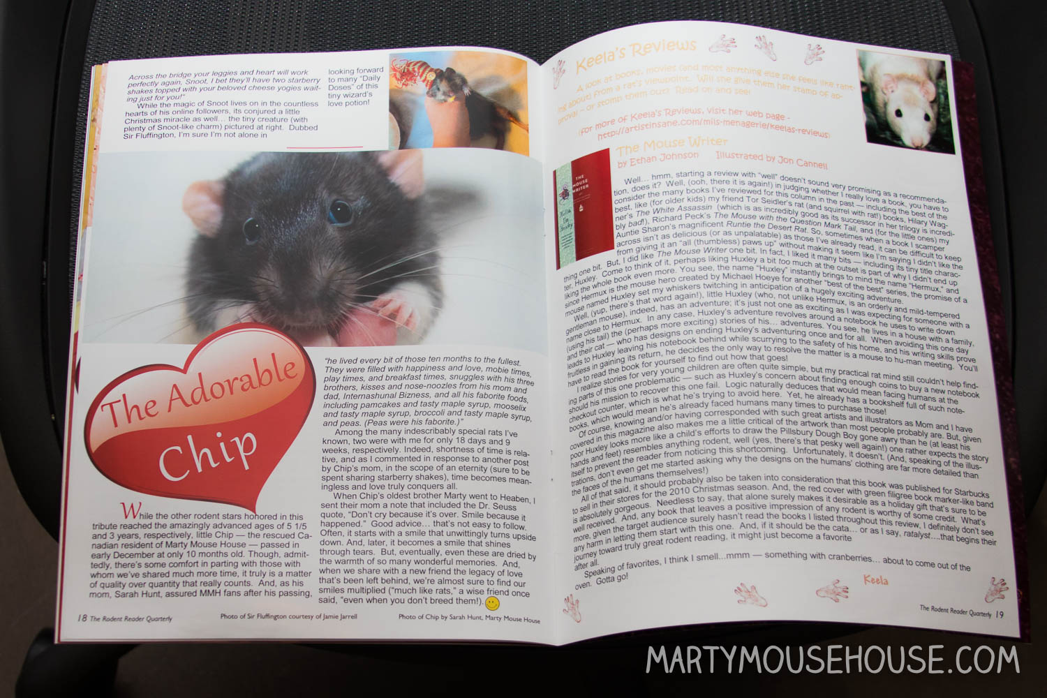 Christmas in Jamuary! In case you habn’t gotten the lastest edition ob the Rodent Reader Quarterly, it’s not too late. There is a beautiful tribute to Chip (and also Sadie and Snoot) in here plus other great rat stuff to read about. Fanks Mil!