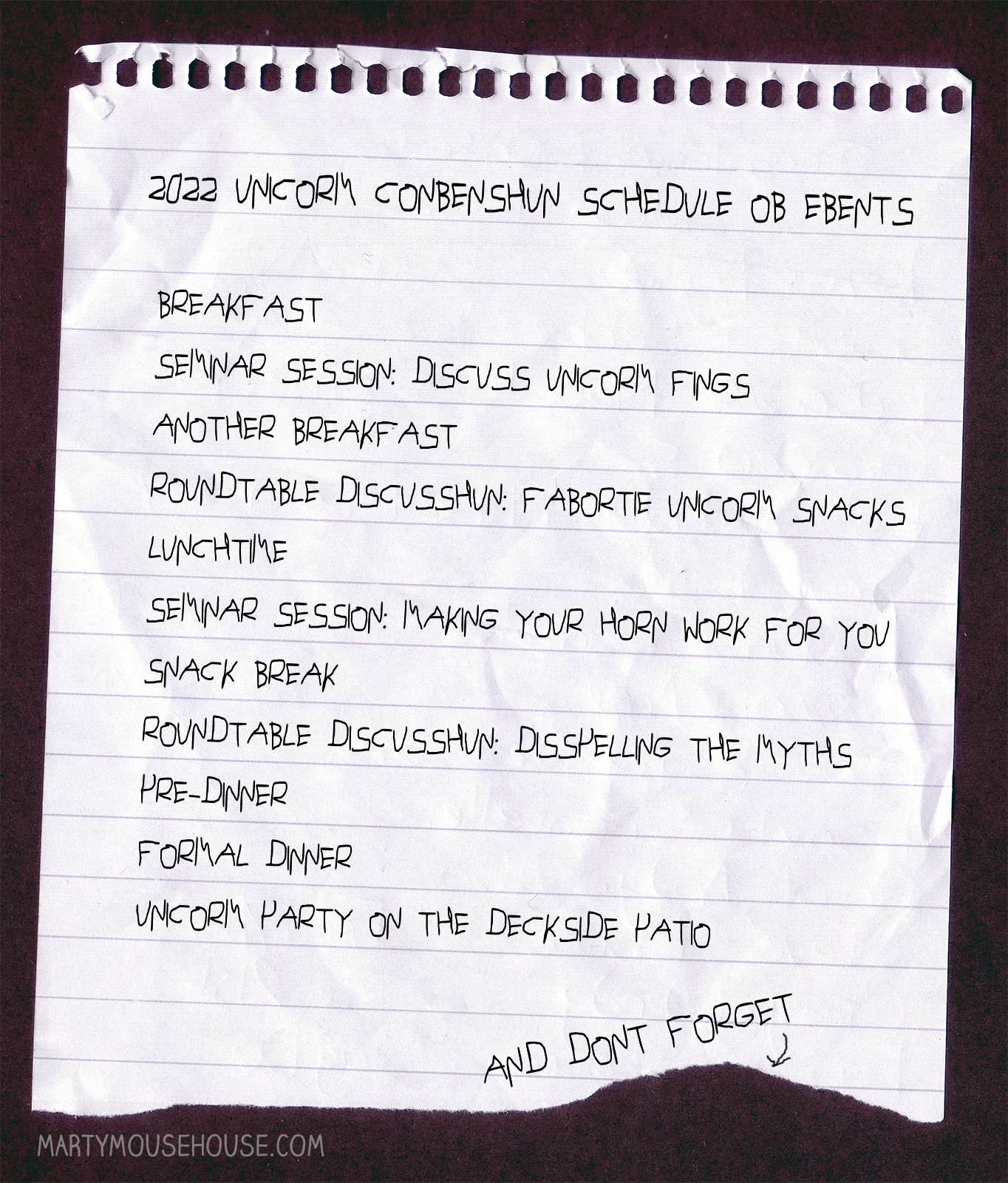 This is obviously a red herring. A secret unicorm conbenshun could neber be happening at your hotel. Dis is probably just a sneaky way to distract you from where da real conbenshun is. Don’t fall for it and leave your hotel (and take all your coworkers wiff you) and go search udder nearby hotels.