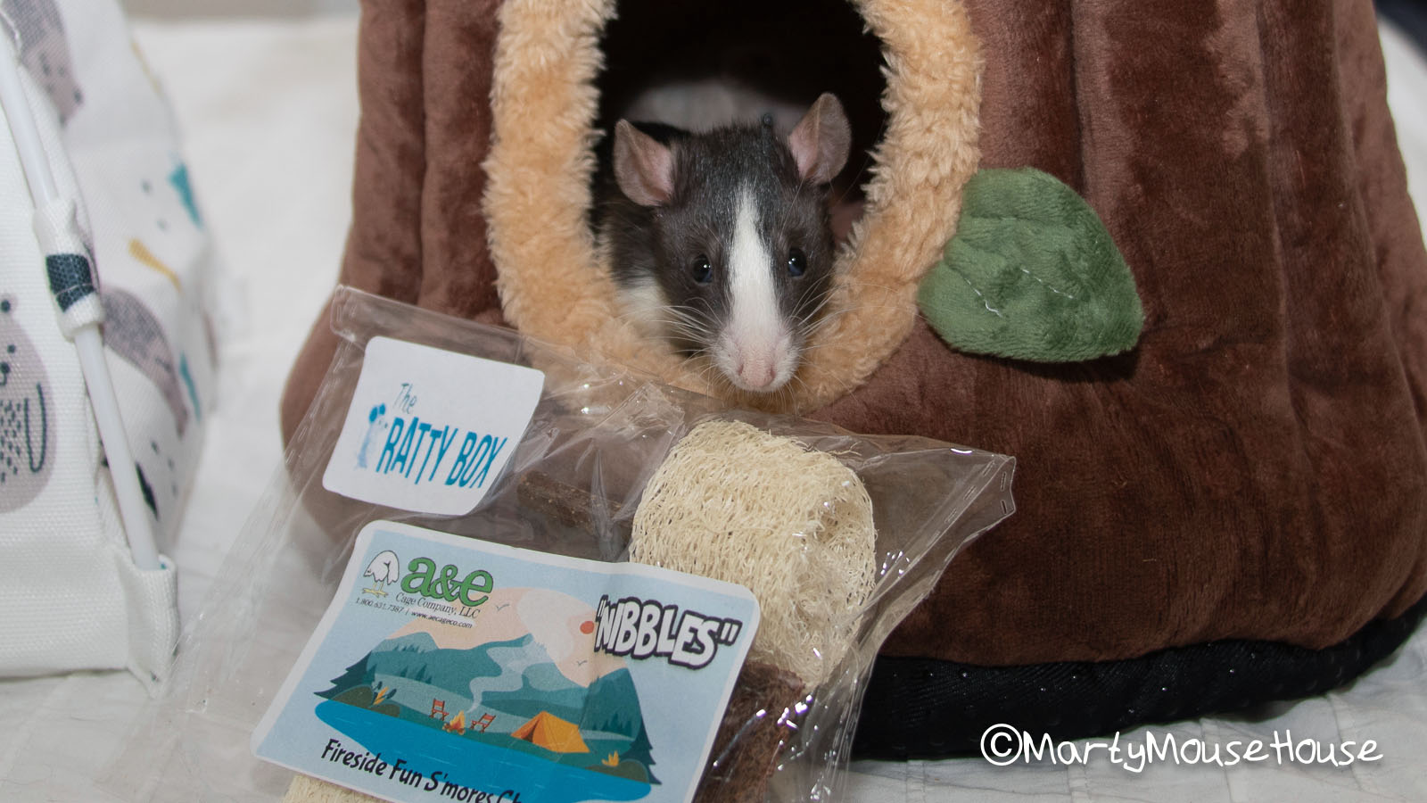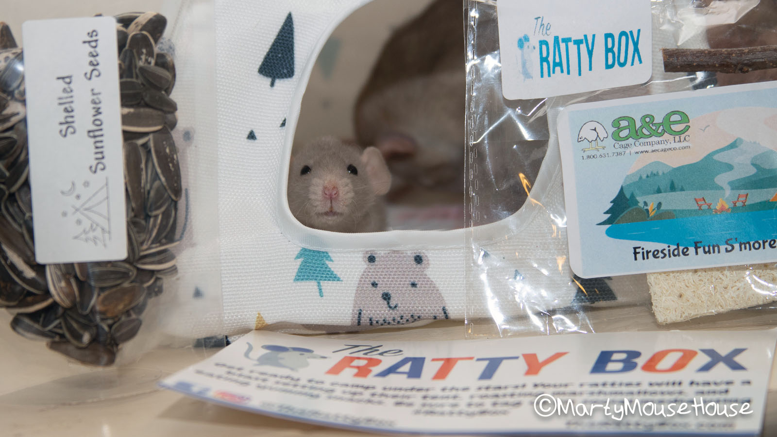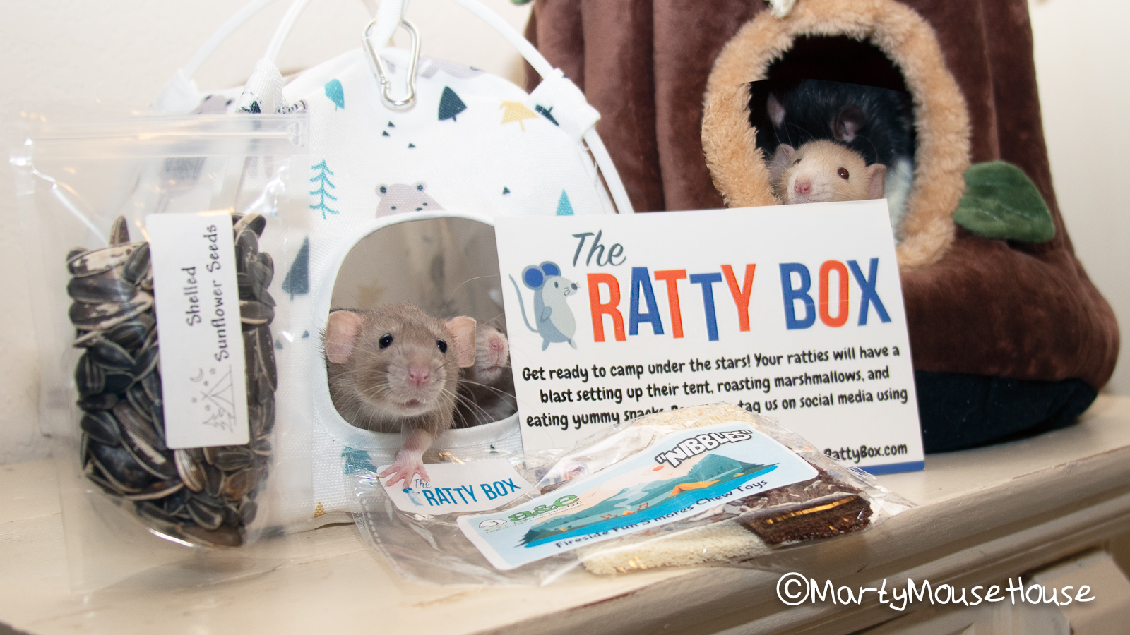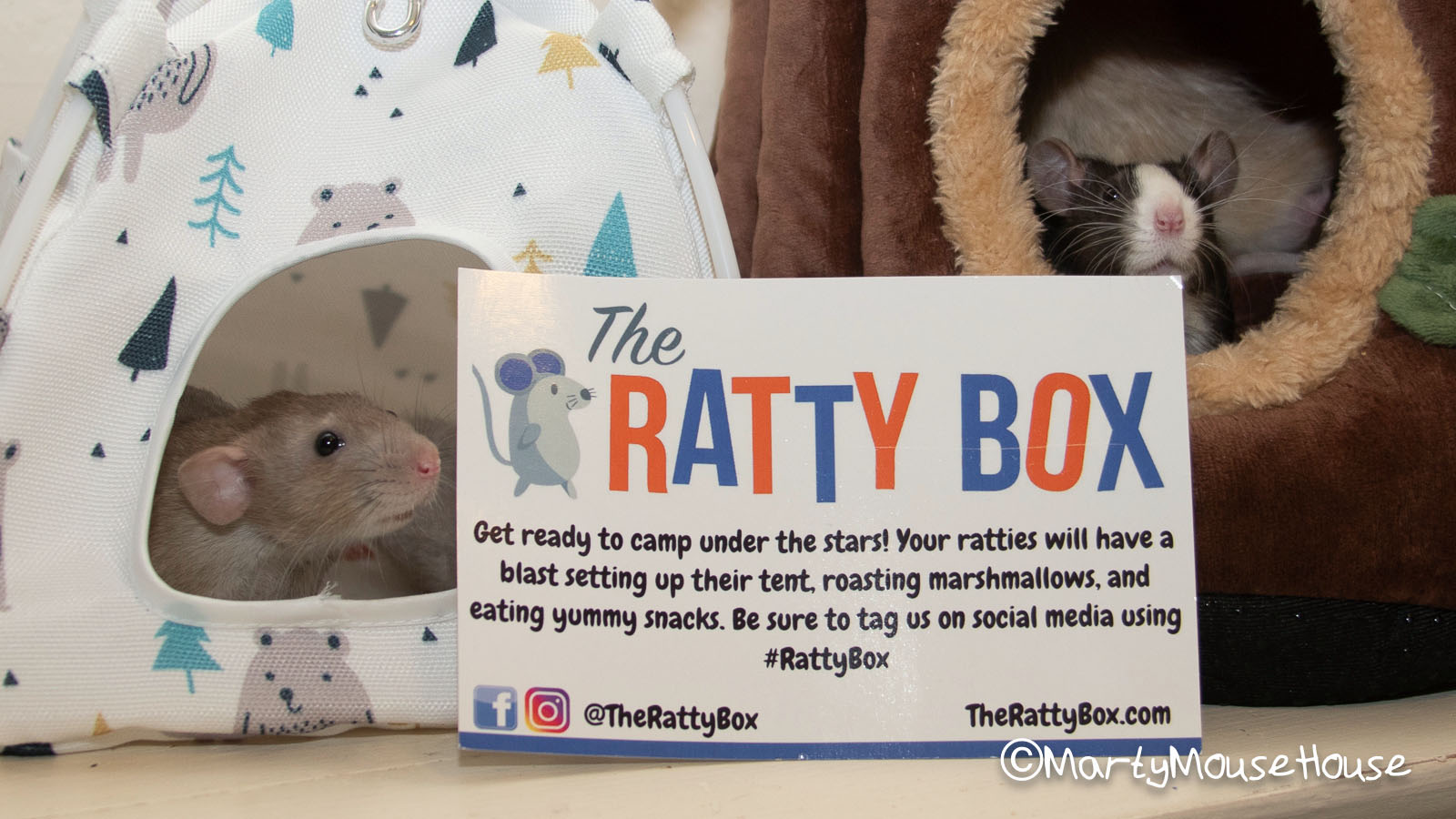 Fanks to #RattyBox we went camping! It was super fun, but Baxter started telling scary stories ober our s’mores campfire, so fankfully we hab a snazzy new tent and comfy tree trunk to hide in to feel safe from the one-armed man dat was looking for us in the forest. We had good sunflower seed snacks, and stayed up talking and laughing until “way past your bedtime youngsters”… but it was a good time and we don’t regret anyfing. Hmmm…we neber did try dat mushroom on top ob the tree trunk.