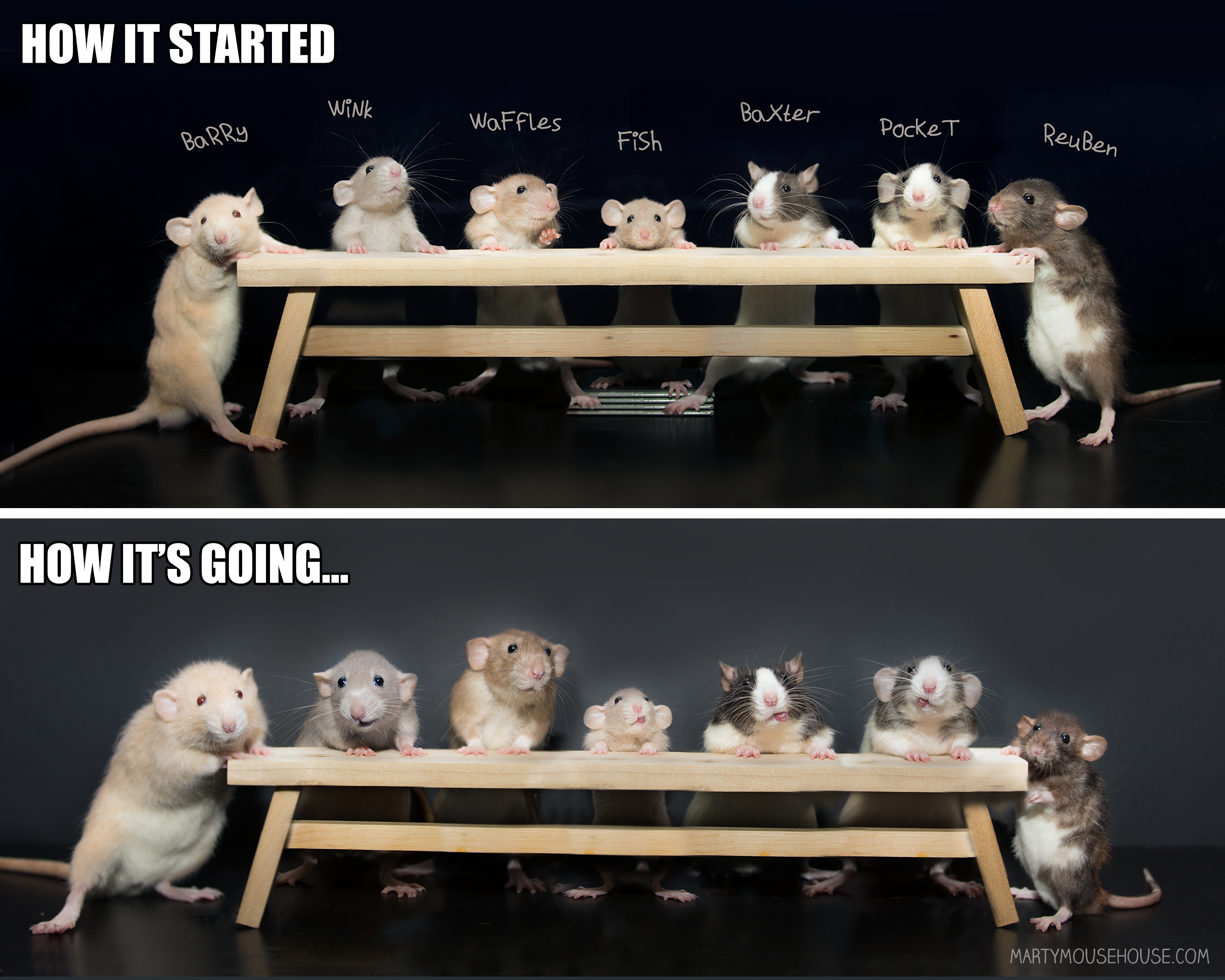 It’s been two months – here is a progress report on the boys and their sisters Pocket and Wink from Rats Have Feelings Too! And look… Fish can reach the table without standing on magnets.