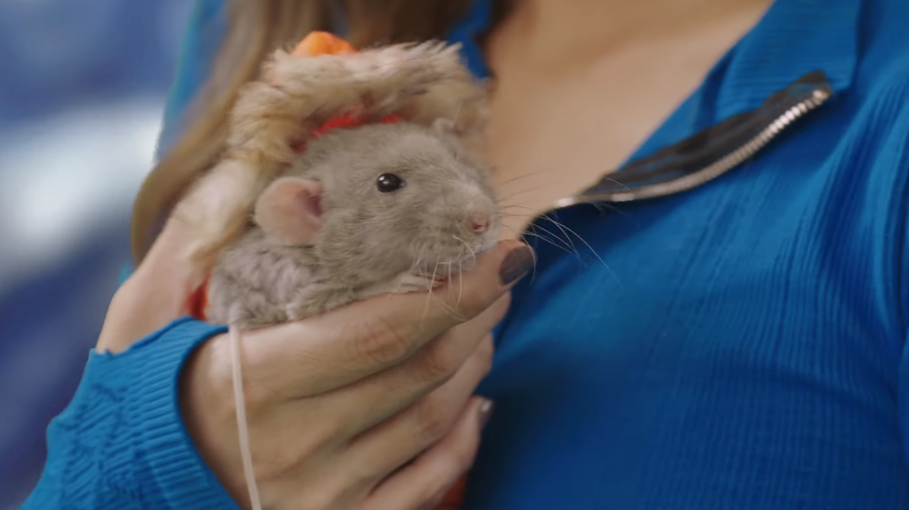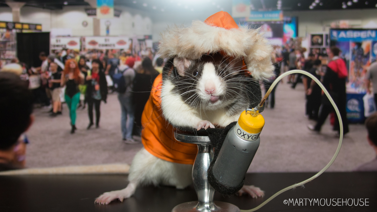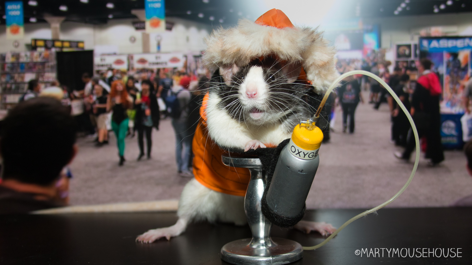If you habn’t been to Comic Con, lots ob people dress up as their faborite characters from mobies and comics and stuff and walk around the conbenshun and buy stuff from bendors. I hab already seen elebenty Supermans, seben Spidermans and fibe Batmans. Eberybodies costumes are so good. I’m dressed as my faborite character – Harriet, as played by Augie in the mobie N’Everest. He was in dat mobie wiff aunt Minae, they were so good together, it inspired me to come as Harriet today, a rat superhero!