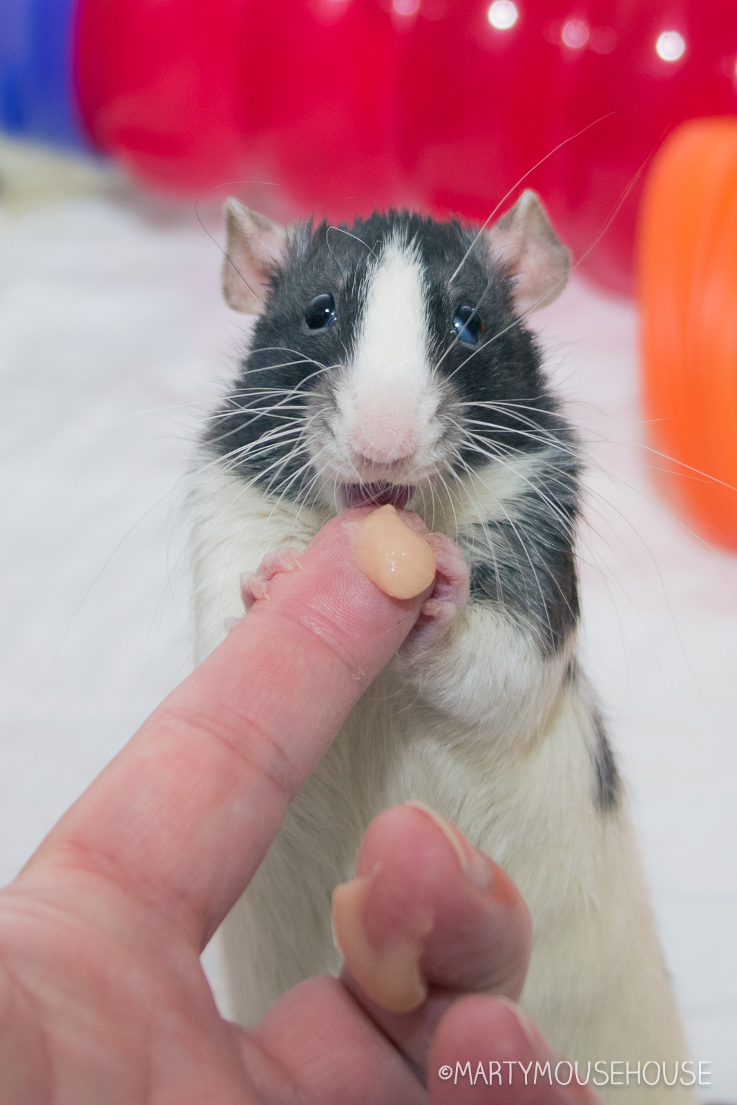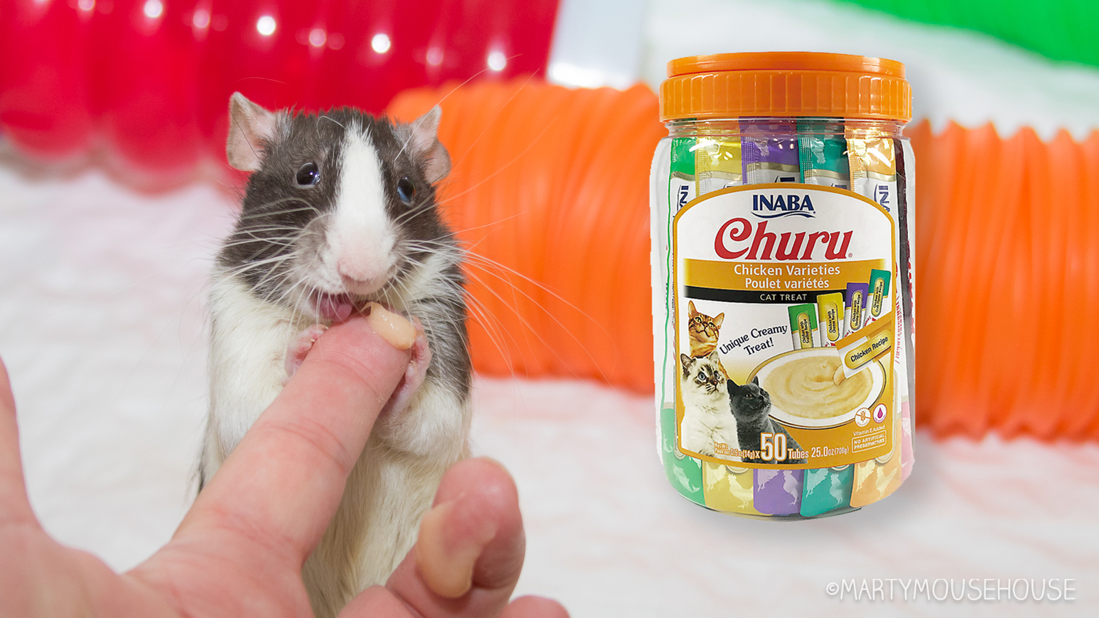 We discobered Churu when we got our cat Murphy, we hadn’t heard ob it before.  It’s like crack for cats, but guess what?  Rats lub it too.  Baxter had to hab meds for a short time and it worked like a charm, mixed with Churu it was a treat!