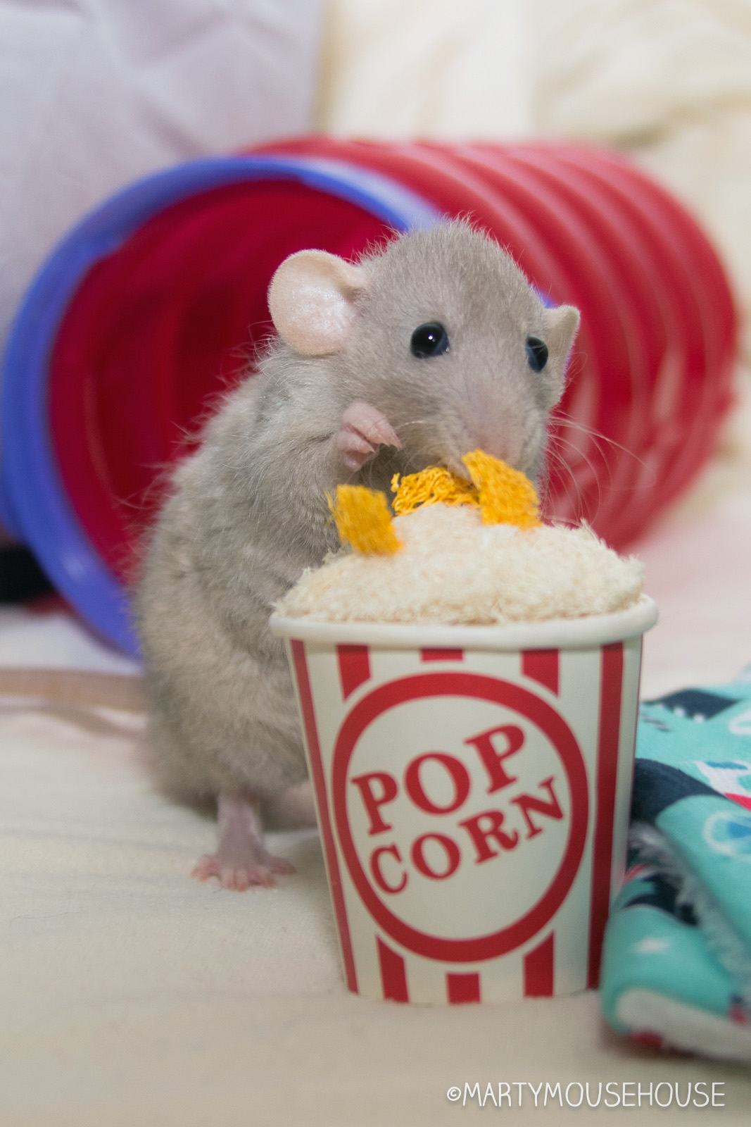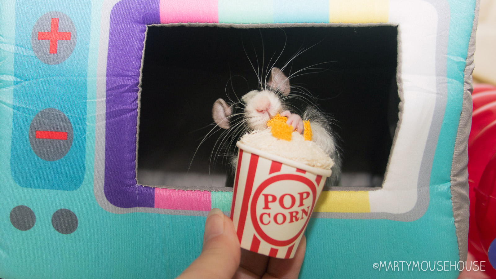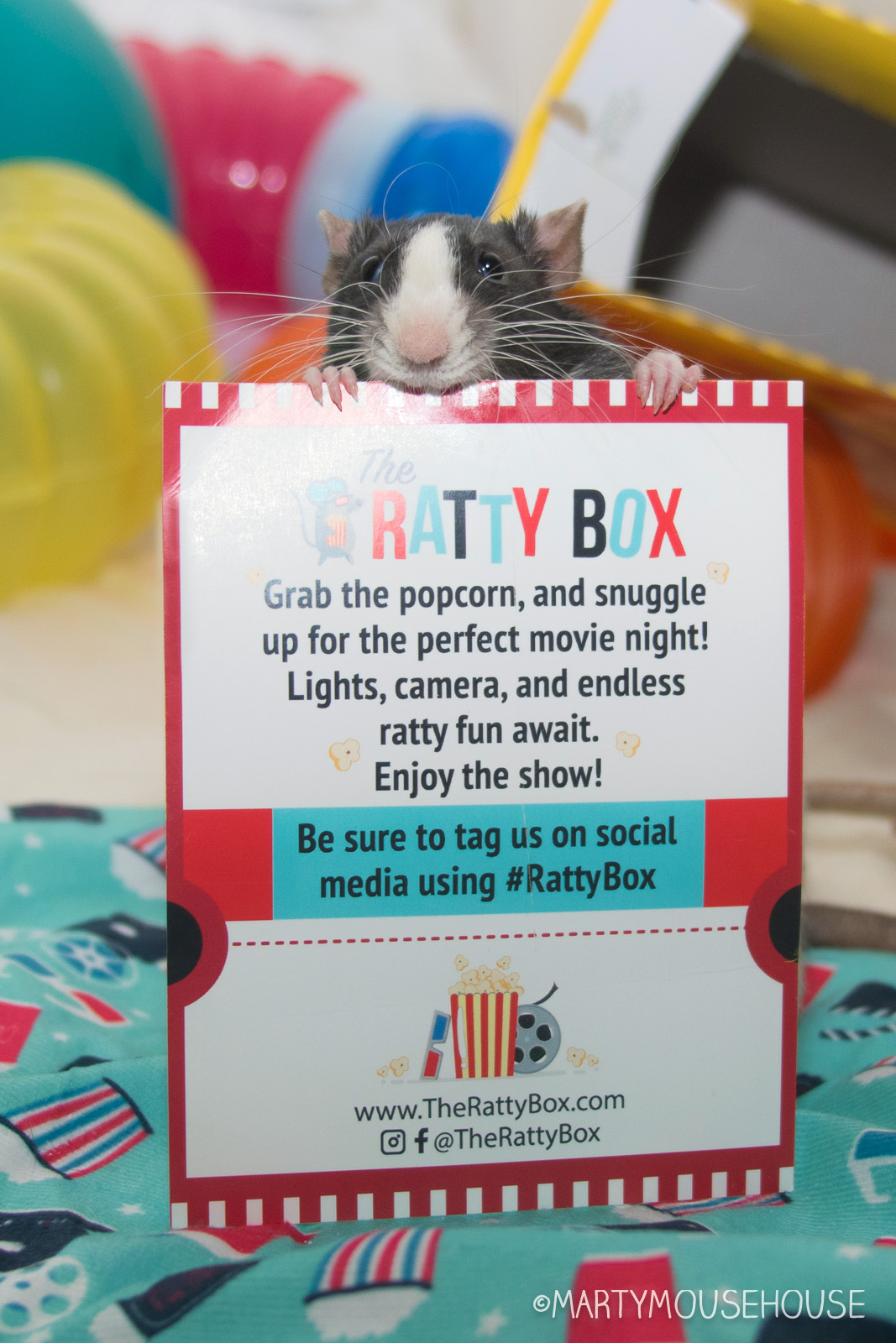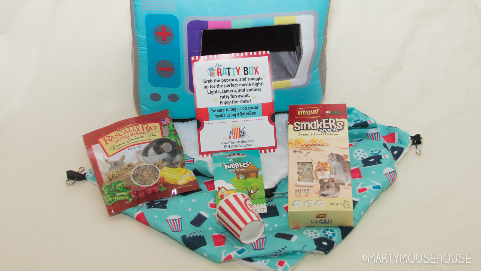 You can hab your own mobie night playhouse wiff a box from Ratty Box too! Dis months box features a TB box hide/playhouse, a mobie themed hammock, LaFebers Rascally Rat Nutri-Berries, Smakers Snack and a big bucket ob Popcorms!