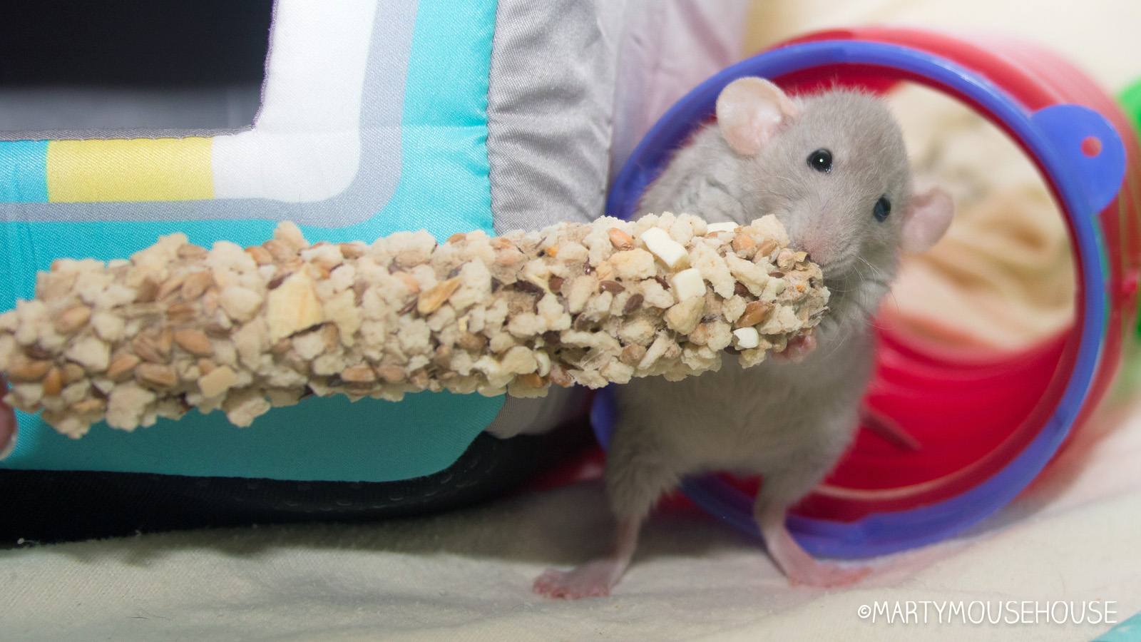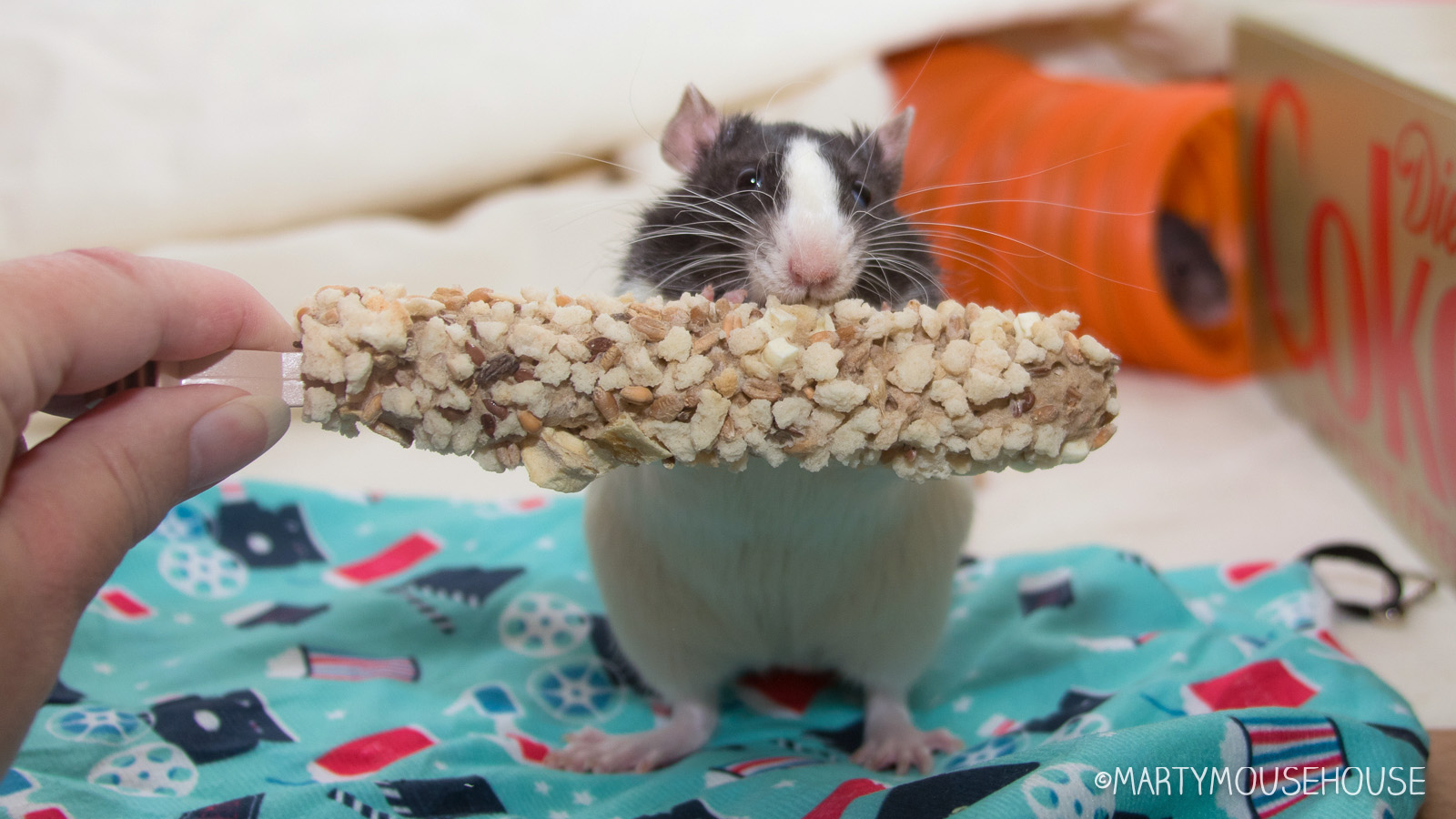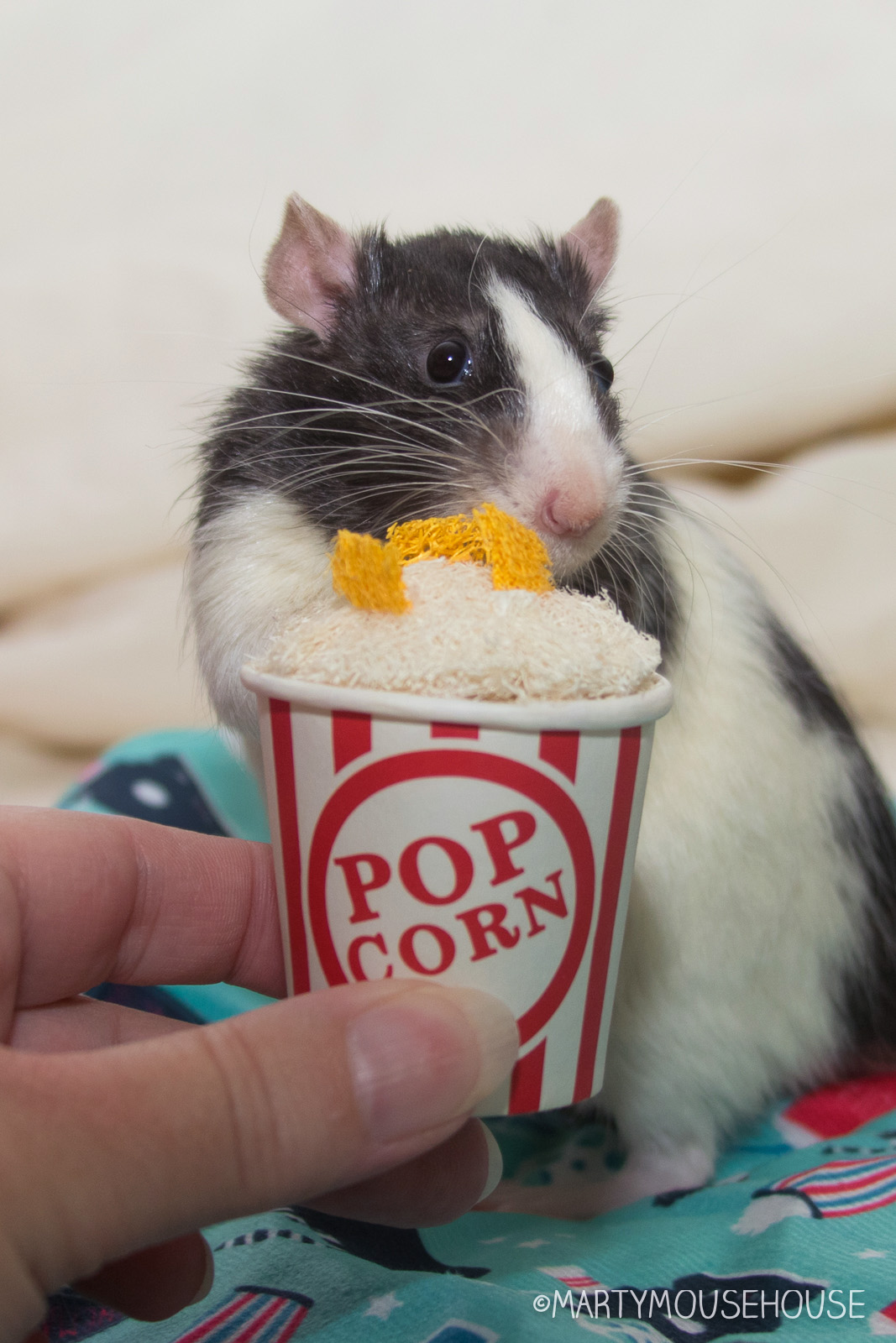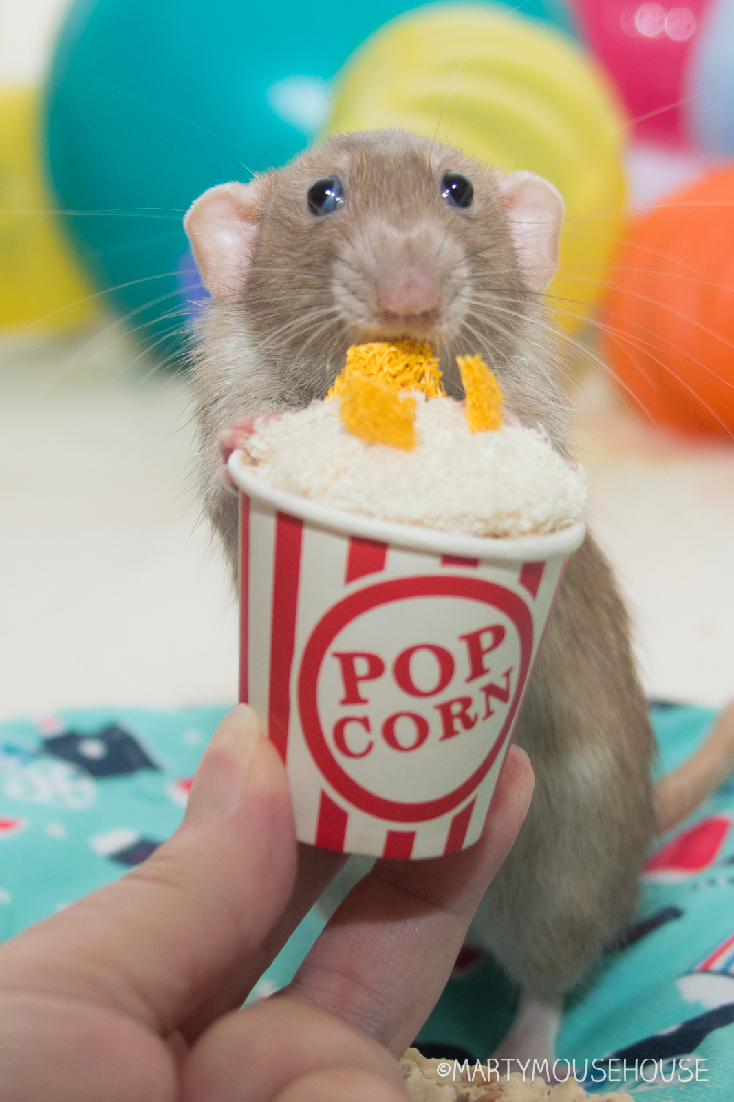 You can hab your own mobie night playhouse wiff a box from Ratty Box too! Dis months box features a TB box hide/playhouse, a mobie themed hammock, LaFebers Rascally Rat Nutri-Berries, Smakers Snack and a big bucket ob Popcorms!