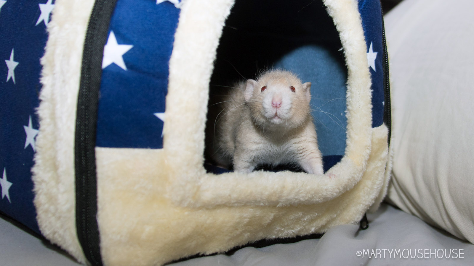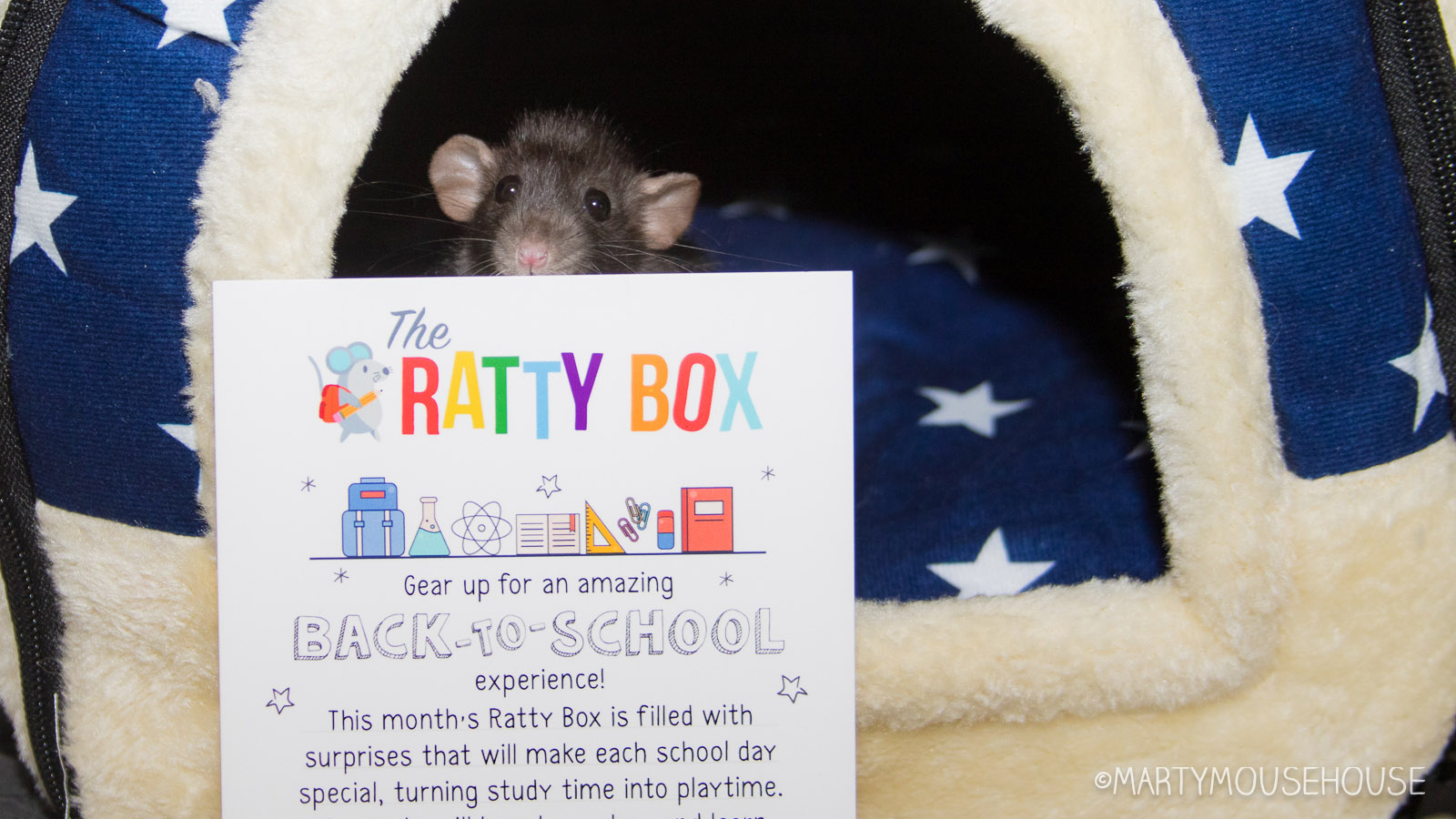 The Back to School Ratty Box is here, just in time for our trabels to be ober (just for now) and go back to school! Dis big hide is great, it habs stars all ober it so it’s like we are in space. And there are two smaller hides too…and nanner chips..and a play toy! Fanks The Ratty Box for welcoming us back to school!