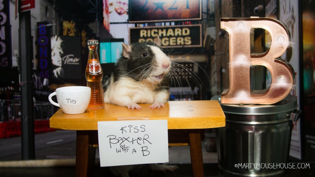 Hello, it’s me Baxter! You might remember I had a dream, to go on Broadway wiff my one man show – Baxter wiff a B.  So now dat we hab granulated, I am going after my dream, so I figured where better to hab my kissing boof than on Broadway where I can be discobered and there are lots ob people!  So if you want to kiss me, best to do it now before I get too famous and become unapproachable.  I mean, you can always approach me, but there might be too many people around me trying to get my autograph or listen to me sing.  Anyway, I’m here for kisses tonight for one night only and I hab my hydrashun so I can gib many kisses for Balemtimes Day – there is already quite a line but I’m working my way fru it quickly, plus I hab the other two boys wiff a B here to take turns.  Who’s next??