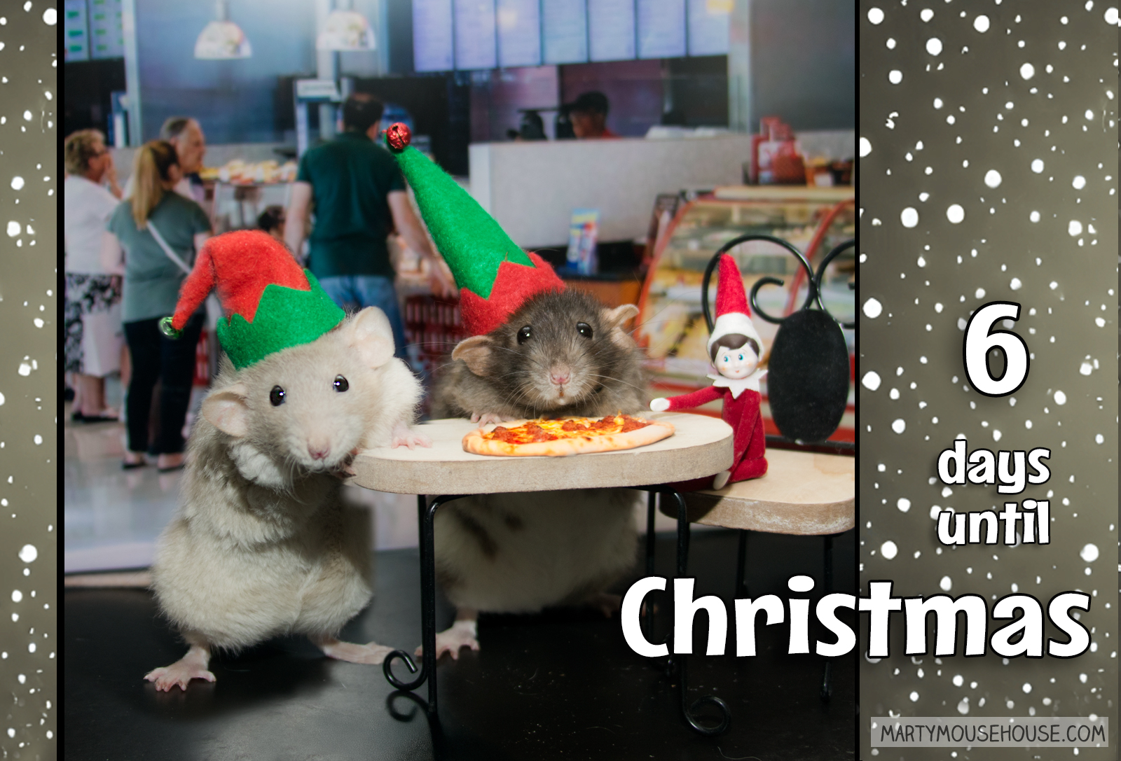 Fish, Reuben, and Dill, the three little elves, marched into the mall wiff jingling pockets that held their carefully counted Christmas shopping monies. Feeling ambitious but hungry, they made their way to the food court, lured by the delicious aroma ob pizza, cookies, hotdogs on a stick and ob course the tastiest fing eber – Cinnabons! After indulging in all the good snacks and rebeling in the holiday atmosphere, Fish pulled out their coin pouch and realized they spent all their monies on snacks. The three stared at each other in wide-eyed realization, then burst into laughter, deciding lub and laughter was the best gift ob all anyway. Hopefully their brothers would fink so too.