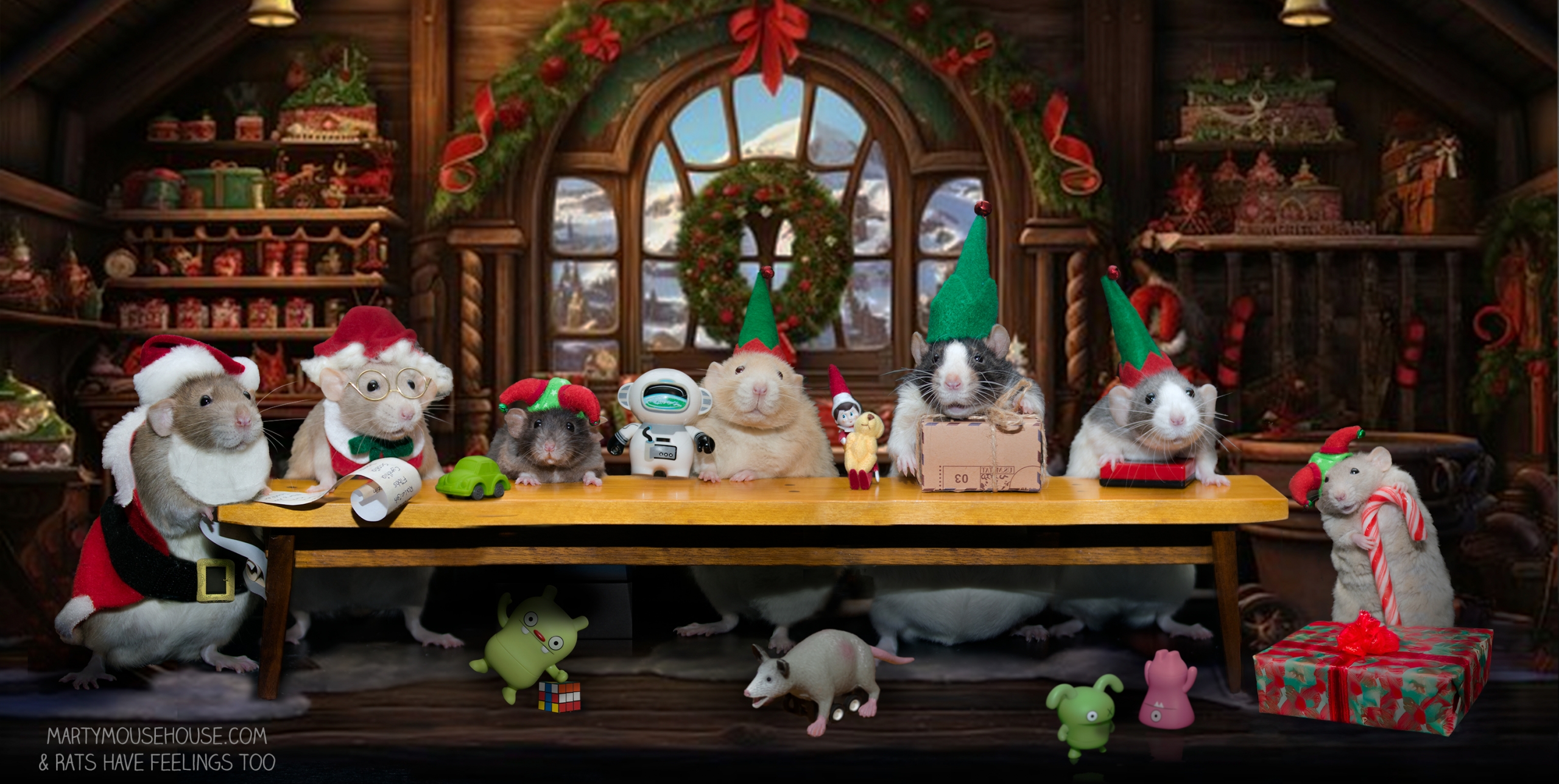 Fanks to Wink and Pocket, our sisters (from Rats Have Feelings Too) who came to the Norff Pole to join in on the fun as Mrs. Claus (Wink) and Pocket as our offishul Etch-A-Sketch inspektor. We lub our big family reunions!!