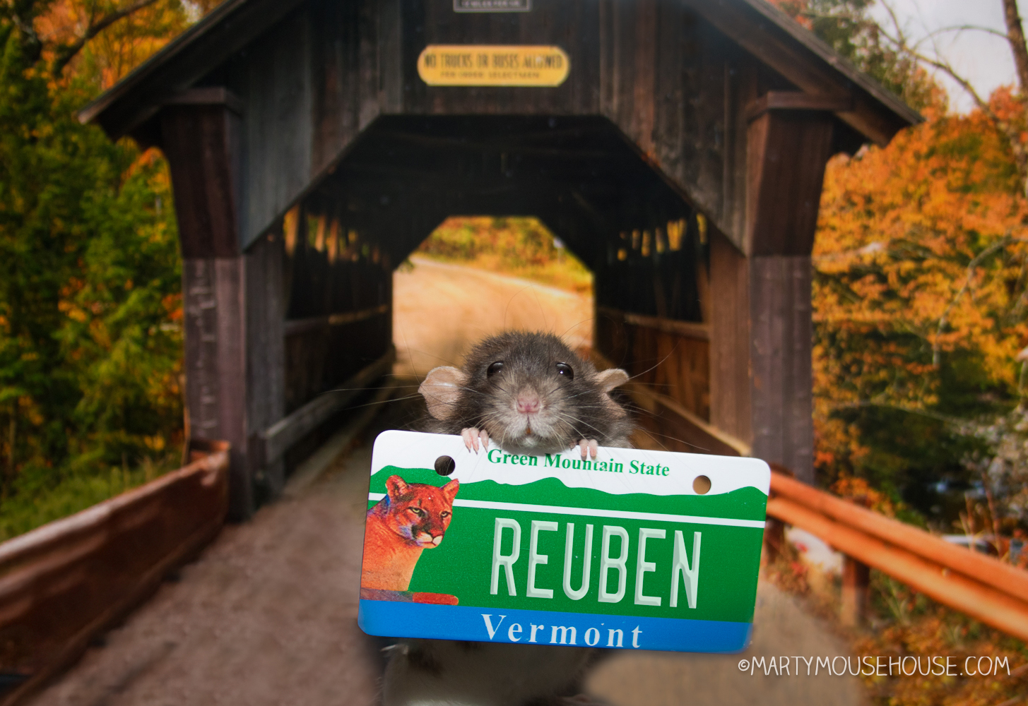 We are in Bermont today, we bisited the Unibersity in Burlington and a couple cobered bridges because they are famous for those. Ob course had a big lunch, and here in Bermont they put maple syrup on eberyfing, which is awesome! Baxter had bacon and eggs, Rueben had smashed taters, Fish had a salmon florentine, Barry had apple pie and I had a club sandwich (are you in the club? Frilly toofpicks? I’m for ’em!) and all ob it was better wiff maple syrup!