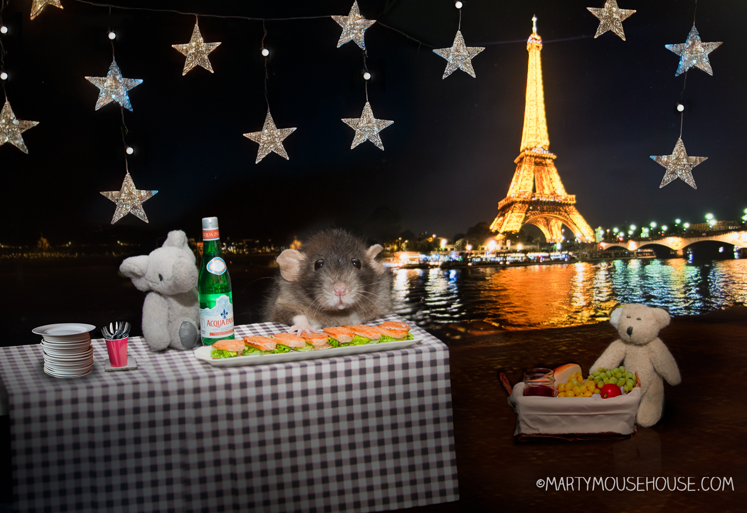 We spent the whole afternoon setting up the perfect Paris picnic. Dougie and Teddy worked out the logistics: tablecloth ironed (twice), tin foil stars hand made and strung wiff care (and only a little tape in Teddy’s fur), plates stacked, fruit fluffed. I obersaw cheese placement. It’s a delicate science.