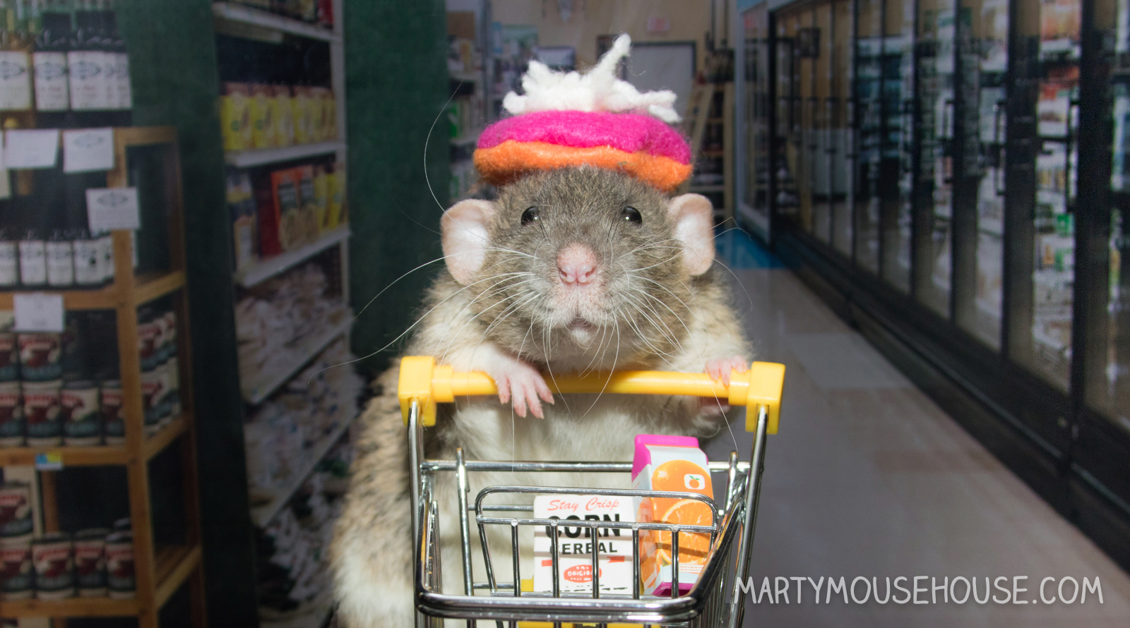 Hi. Guess what? Mom let us go grocery shopping, eben though we are still kind of grounded. We asked real nice, and promised to go there and get straight back home, so here we are getting some good snacks to make up for the horrible jail porridge. We split up and Chip is waiting by the car. Bert is trying out a new look wiff a new hat today. He finks it makes him look smart and like a good poet, but I fink it’s not quite right and maybe he needs to try a different one. Ok, I gotta go. We are on a timer and need to finish shopping. Talk to you later! P.S. dis Nickels.