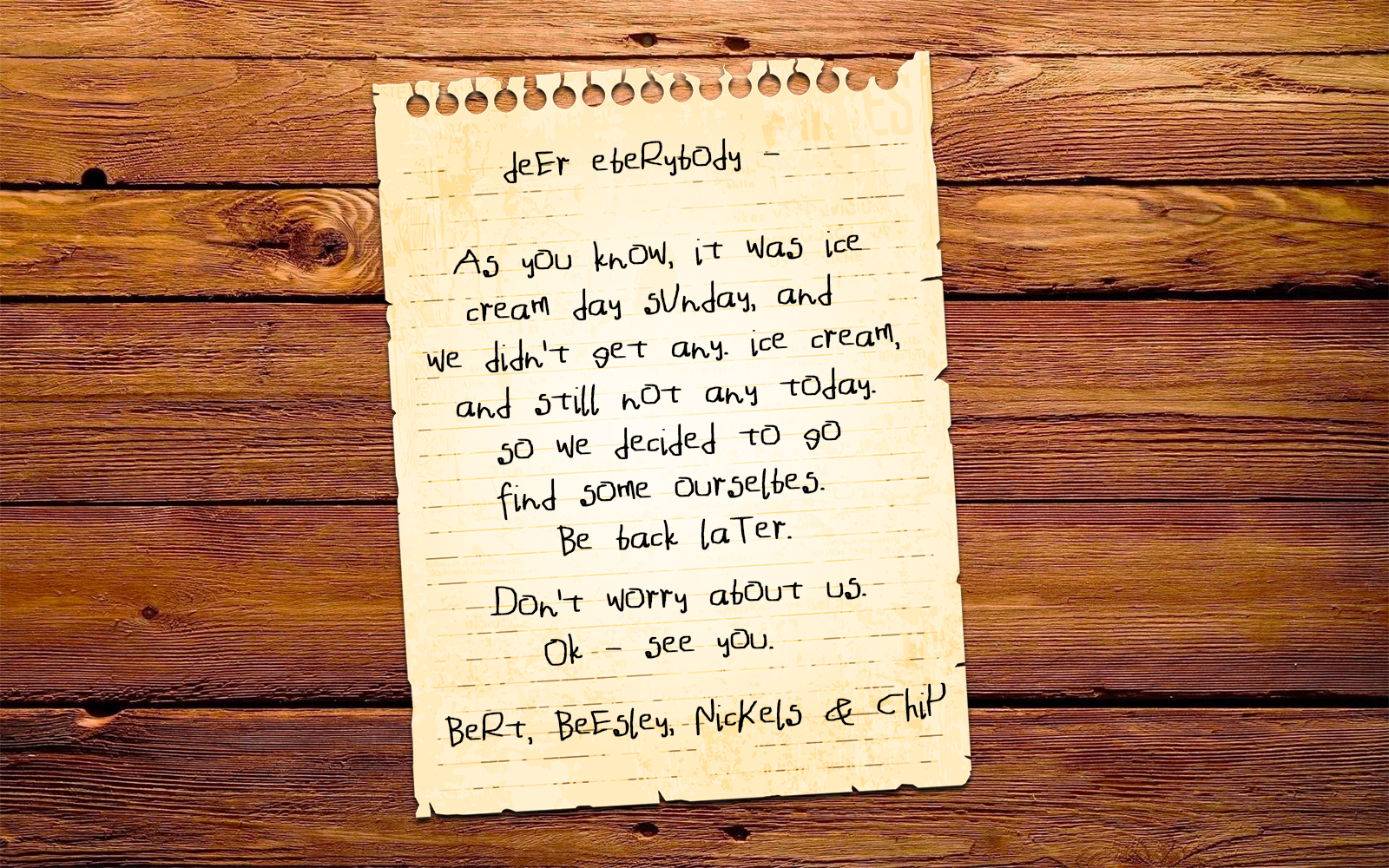I was going to tell you about my announcement again, but then mom came in wiff brownies she made from scratch, and I forgot what I was going to say, because eben though we only got a tiny taste ob the brownie, it was so exciting and yummy. Brownie residoo is the best! We lubbed it alot, and each ob us got a little bite because mom is fair and makes sure we each an equal piece, cause thats only right, if someone got a bigger piece they might be upset and she doesn’t want that to happen. But she always eats the biggest piece which isn’t really fair, but I guess she is bigger than us, and she did make them, so I’m just glad she is willing to share wiff us. Sharing is really important and one ob the fings you should always do, cuz it’s nice.