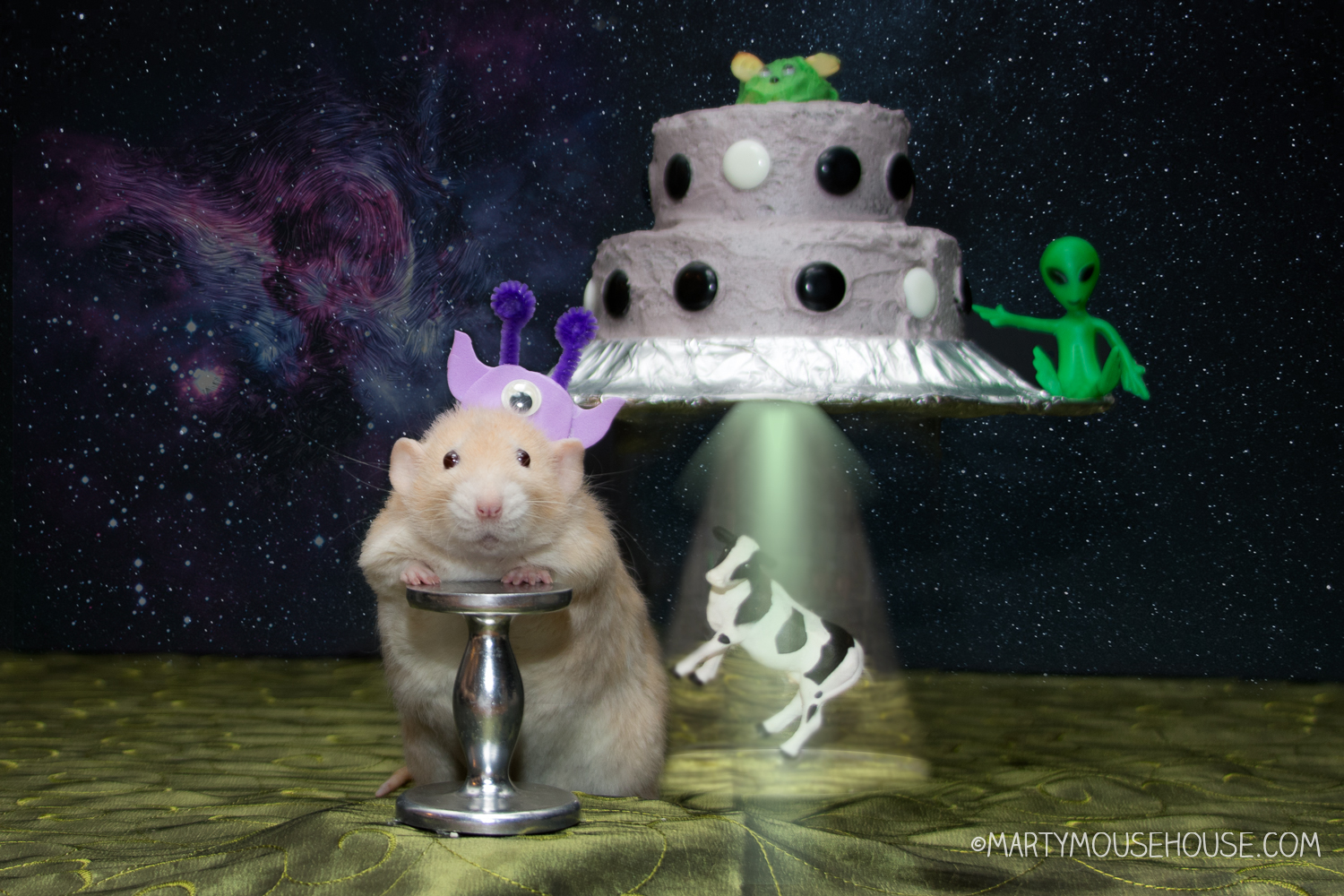 Suddenly, the cake creaked open, and a tractor beam—just a tiny one—shone down on the table. “Initiating cow obduction!” Larry chirped. From above, small cows descended slowly into the beam, mooing mechanically as they floated skyward. Wink clapped her paws in delight while Pocket chased after one of the cows, determined to save it from the “clutches of the cosmos.”