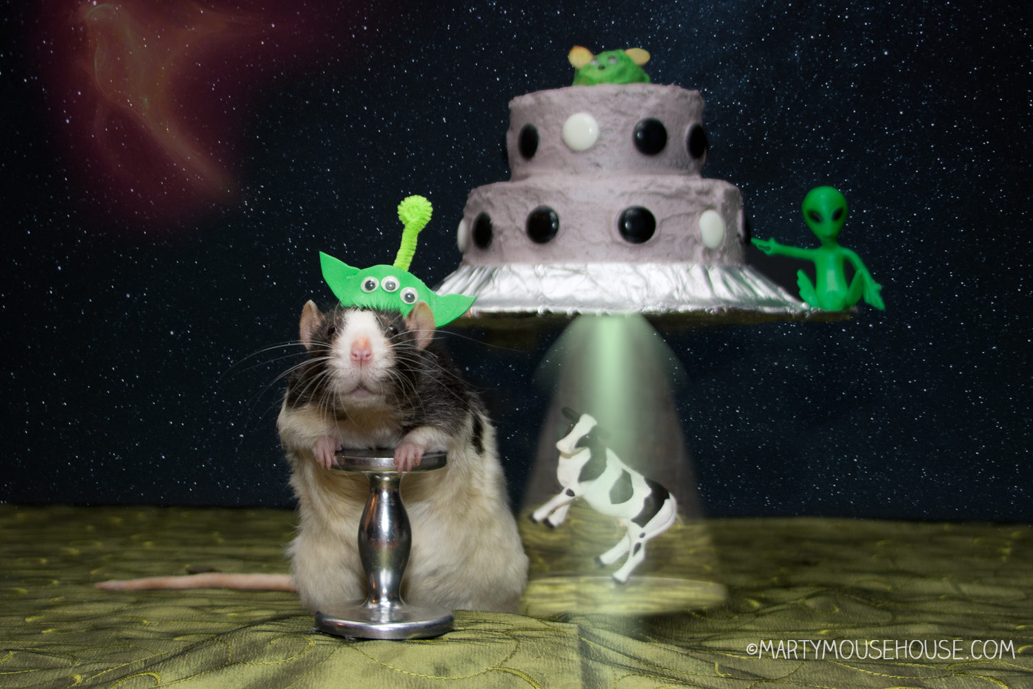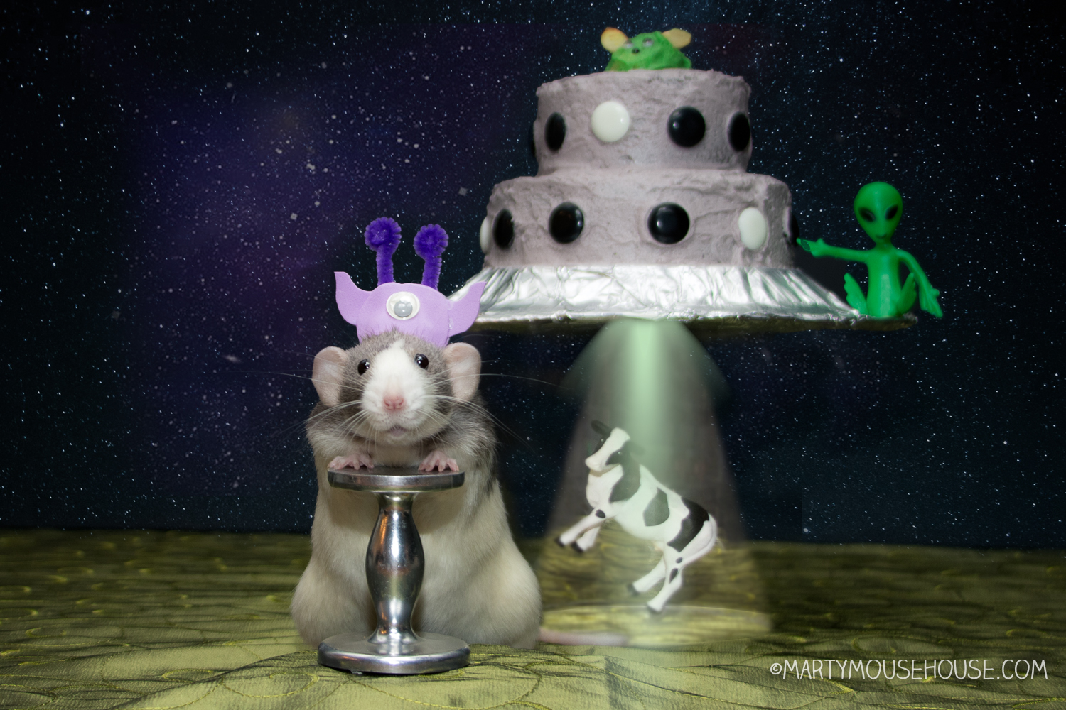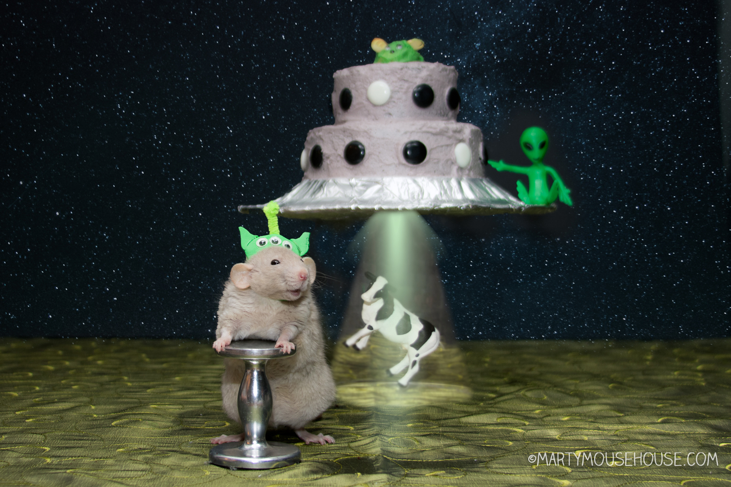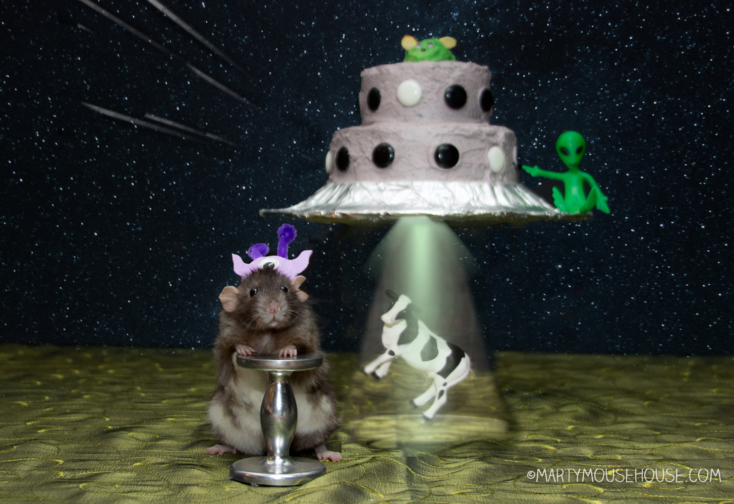 As guests arrived—so many people who loved them, rats and neighborhood critters like Scooty Joon—Larry triggered the fog machine and dimmed the lights. “Commencing birthday protocol,” he announced in his buzzy translator voice, and a laser light show began, complete wiff sparkles, space sounds, and a hologram of Saturn doing a little dance. In the middle of it all, Fish squeaked in joy, pointing out the cheese-shaped craters on the projected moon. “This one’s Camembert Mare,” he whispered reverently, taking notes for his cheese map.