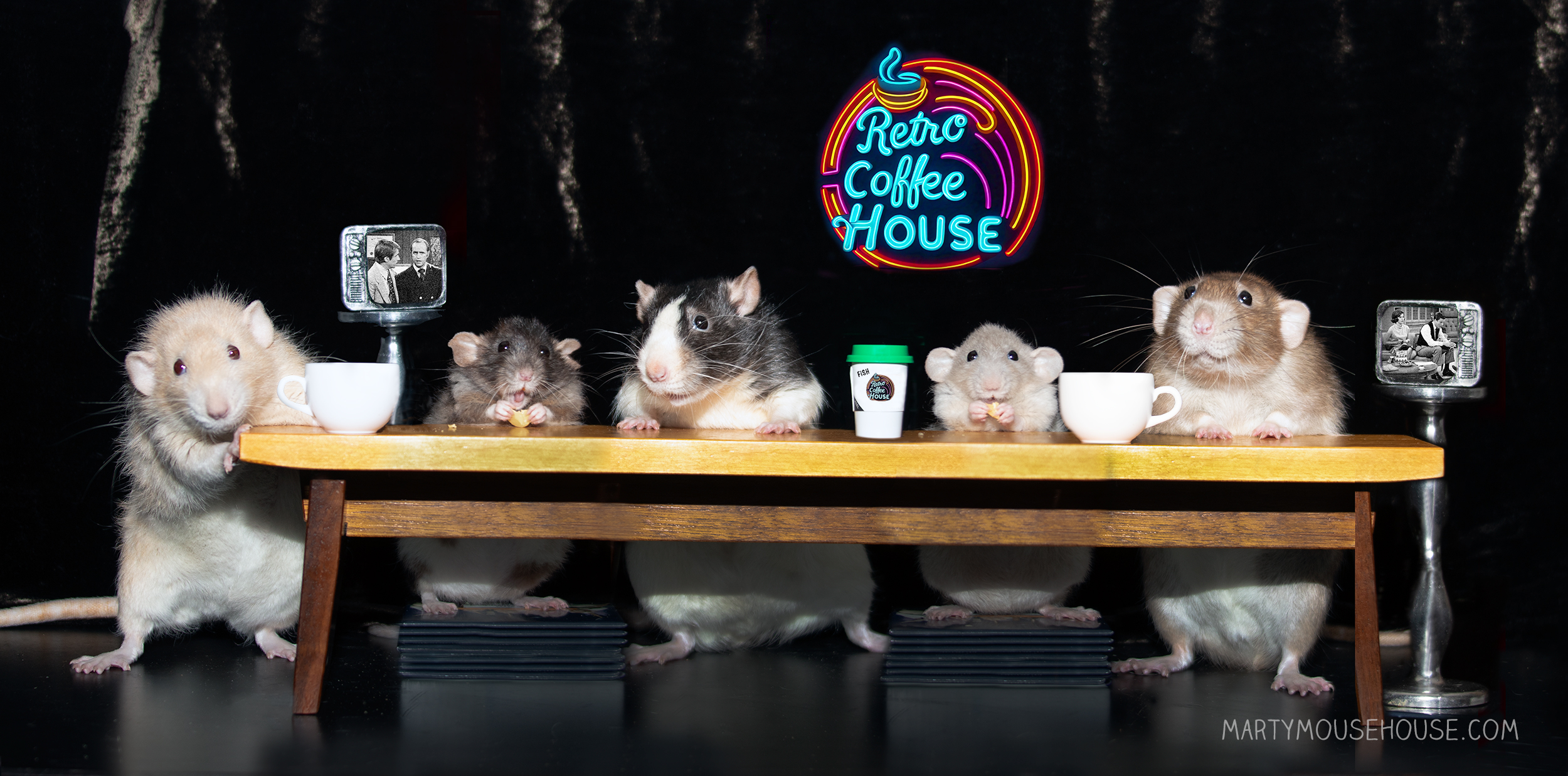 Dis morning we went to a new coffee place called Retro Coffee House and Cafe. They hab really good coffee and pasteries and hab teebees all ober playing bintage teebee shows. We watched some ob the Bob Newhart Show and the Dick bam Dyke show. It was a berry fun place and great way to spend the morning. We talked about all kinds ob fings and got caught up on the latest news wiff each other. Please come join us sometime. P.S. They serbe coffee from Augie’s Cosmopolitan Beanery!