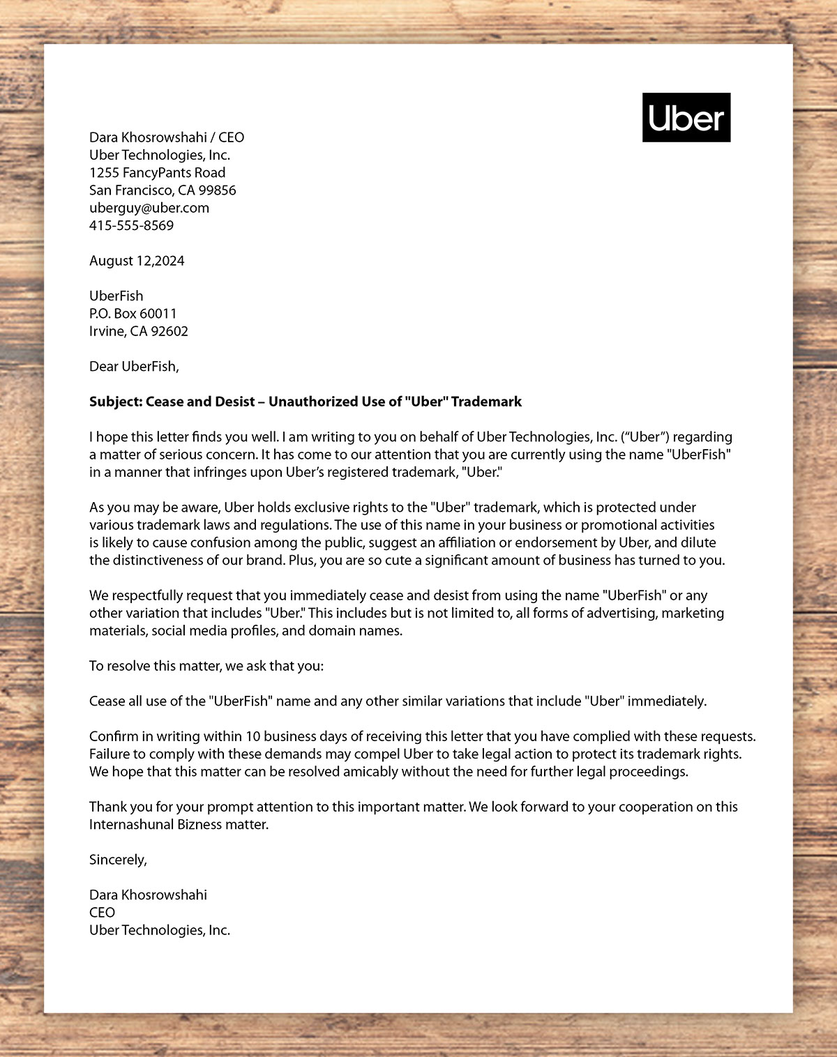 Well, eben tho the guy at Uber was nice when I talked to him, I hab decided to change my bizness name to Go Fish. So if you want to go wiff Fish, you can request me on the Go Fish app. Any my slogan is “wiff Fish, a great ride is always in the cards”.