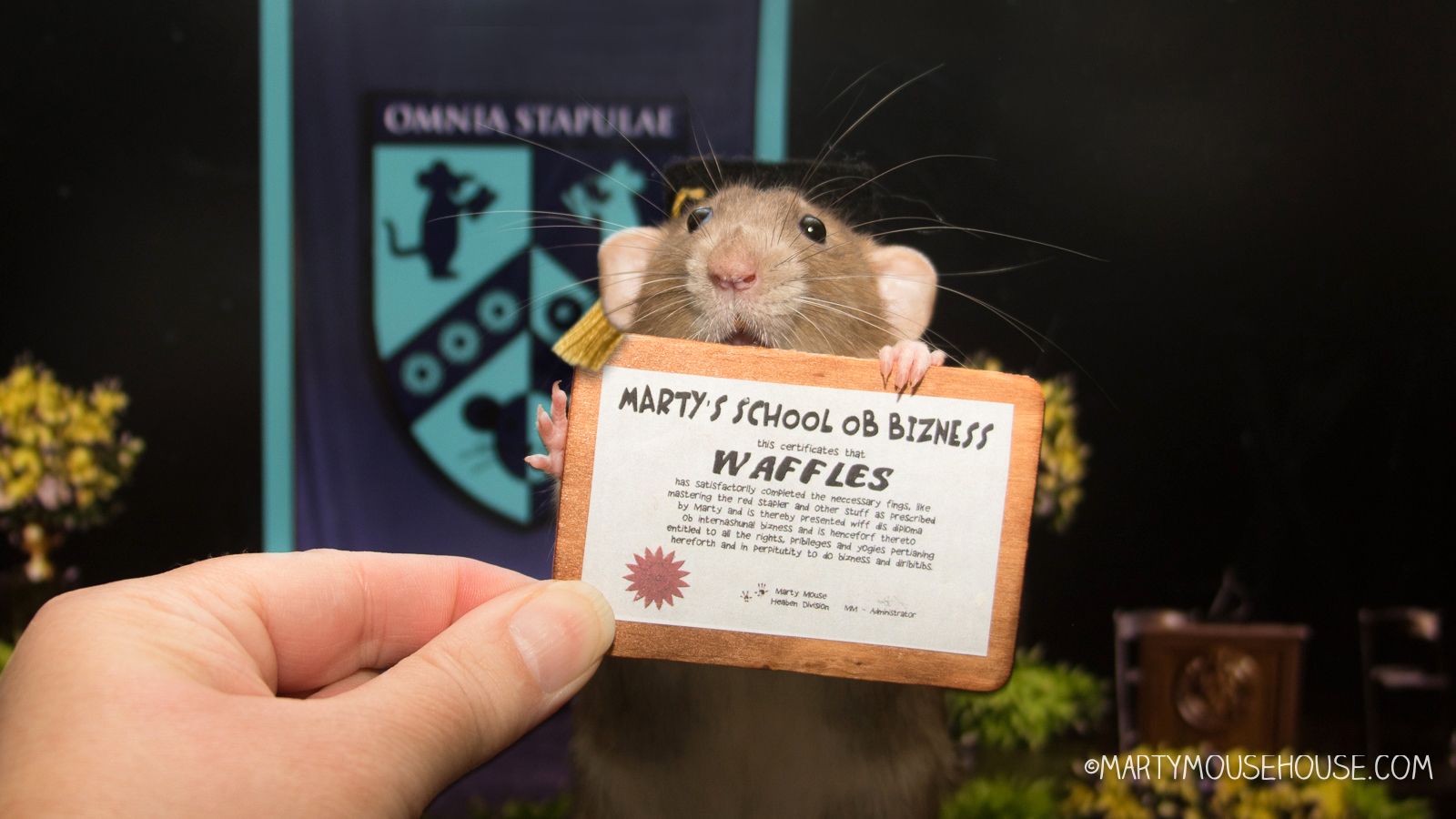 My name is Waffles, and I will be your host. Eberybody boted for me because I like to talk alot, and dis is no excepshun. We are all so excited to be here, after monffs ob studying and hard work we hab come here to be recognized for our accomplishments and take home dat cobeted degree. Eberybody here is excited to go out into the world and apply our knowledge ob Internashunal Bizness to make the world a better place. Our stapling skills, taping, science, maff, history, arting, monies, diribitibs and more will help us do it. We fank you all for your support along the way, we couldn’t hab done it wiffout you. Well, we probably could hab, but eberyfing is better wiff friends.