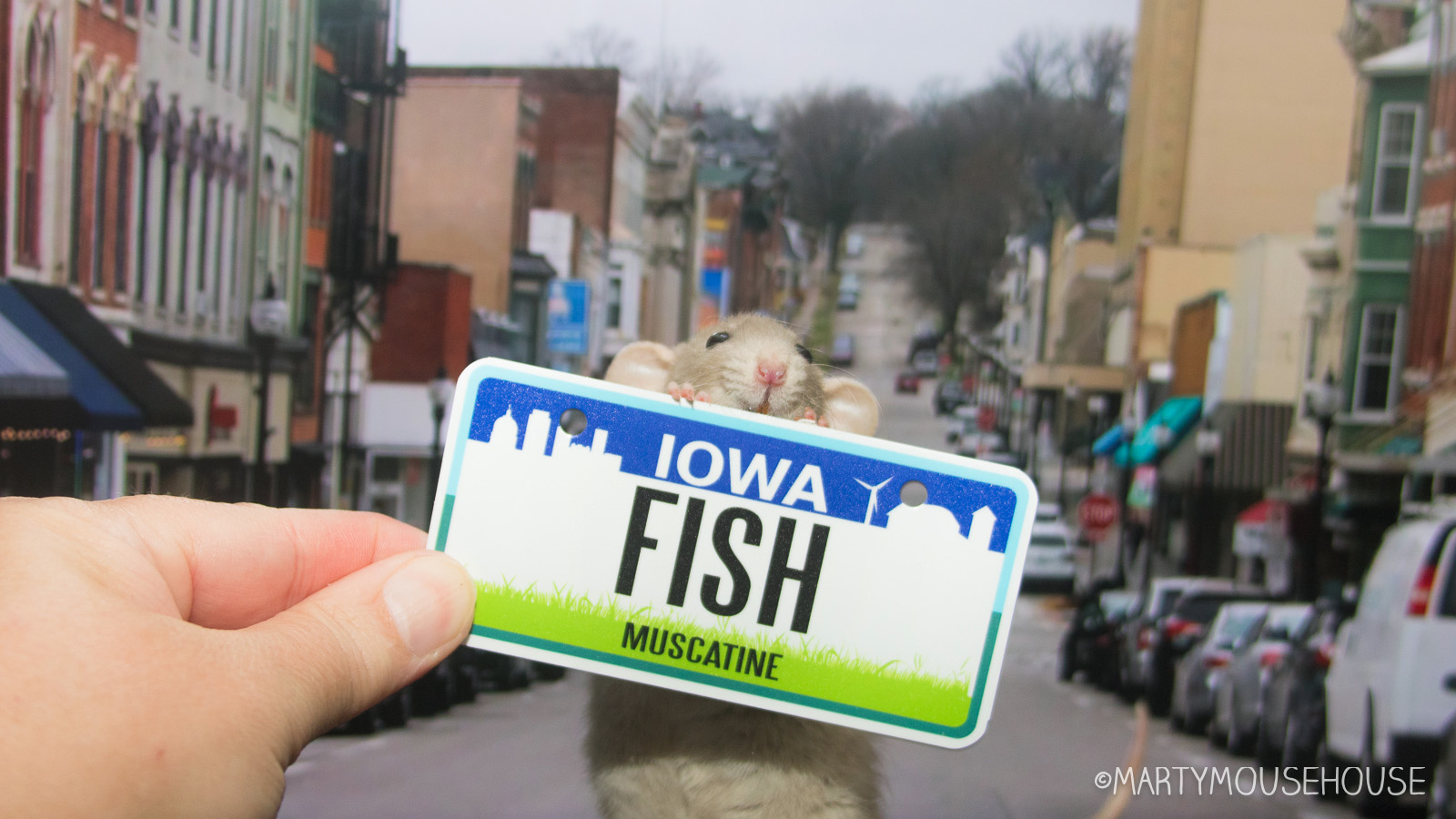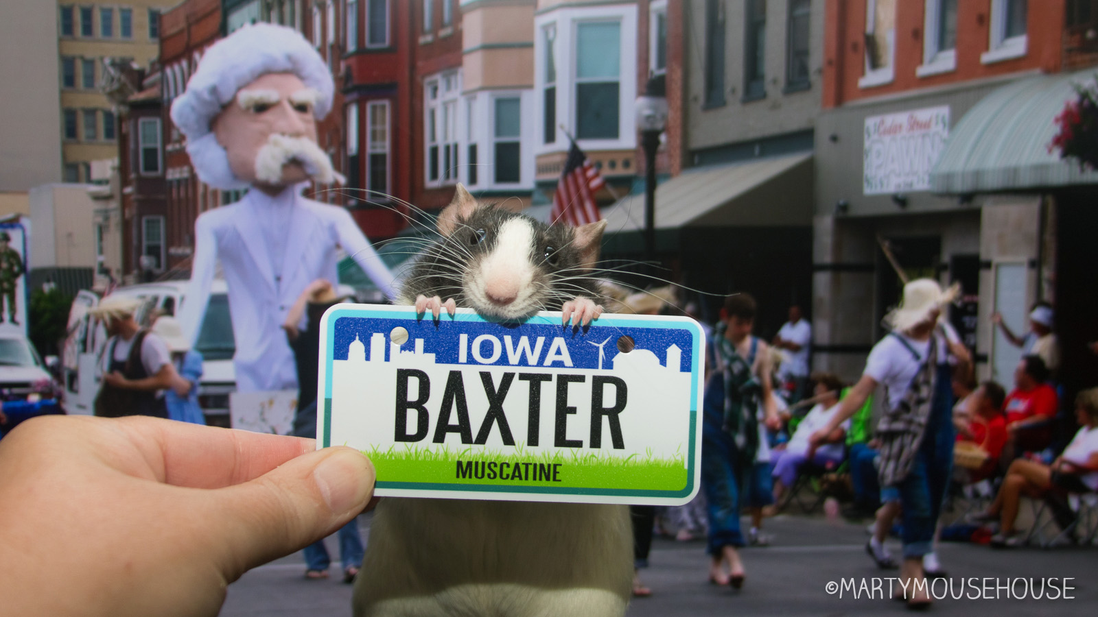 After lunch we went to Muscatime, known as the Pearl Button Capital ob the World. We caught the end ob a parade wiff a giant paper mache Mark Twain. You neber know what you are going to find in Iowa, but it’s always fun. Fank you so much for bizness Birgina Rud – we are in Muscatime now, the Mark Twain parade is ober, so come find us downtown and we can hab dinner wiff you!