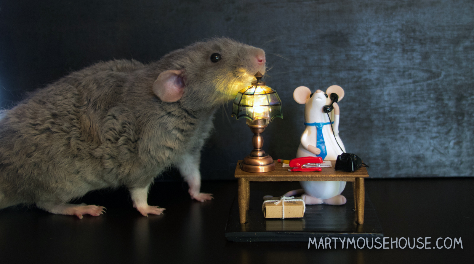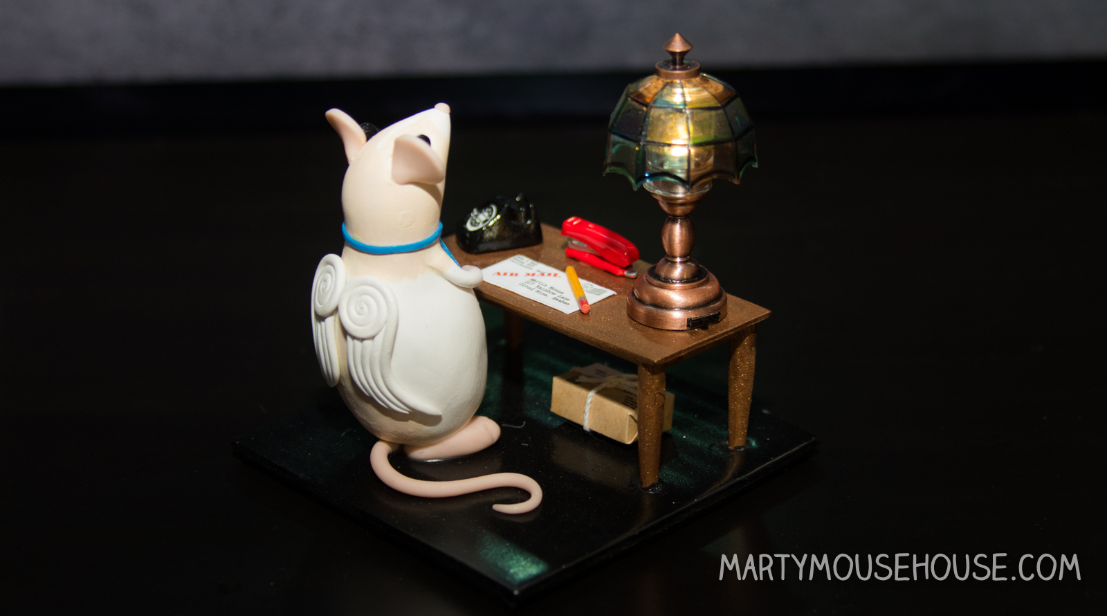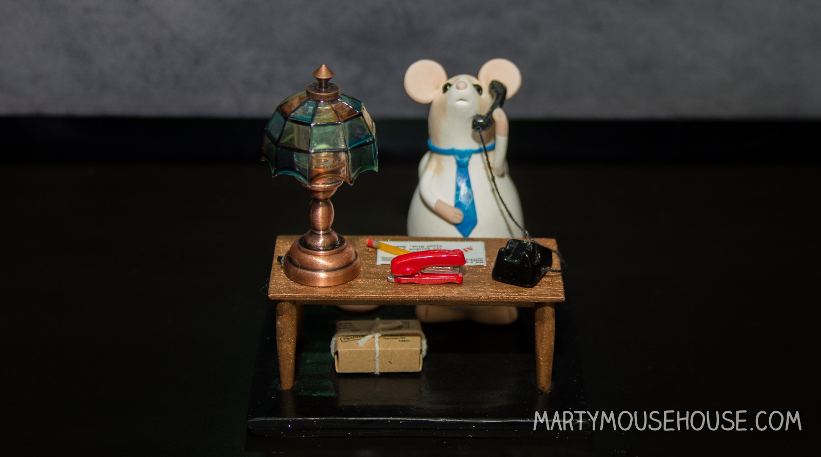 Dis Marty doing Heaben bizness. The lamp really lights up! And the red stapler, and the phone, and the letter, and packages and Marty. The details, I am telling you….It’s Heabenly!!
