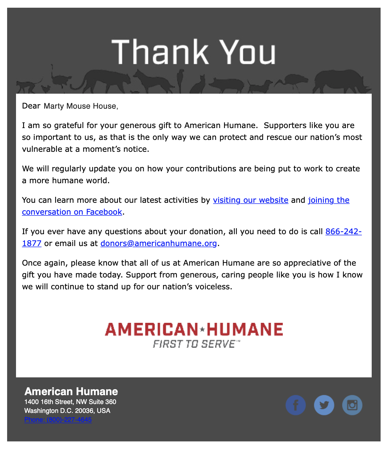 We just gabe the monies to American Humane to help the animals ob the CA wildfires that we made from our art. Between the direct donations (fru their button on Facebook) ob $653 and the percentage of actshun for the paintings, we raised a total ob $1,122!! Fank you to all who donated directly (see below), and to the aucshun winners: Melissa Rice, Diane Cullison, Ashley Frerking and Elizabeff Newby. You guys are amazing – fank you so much!