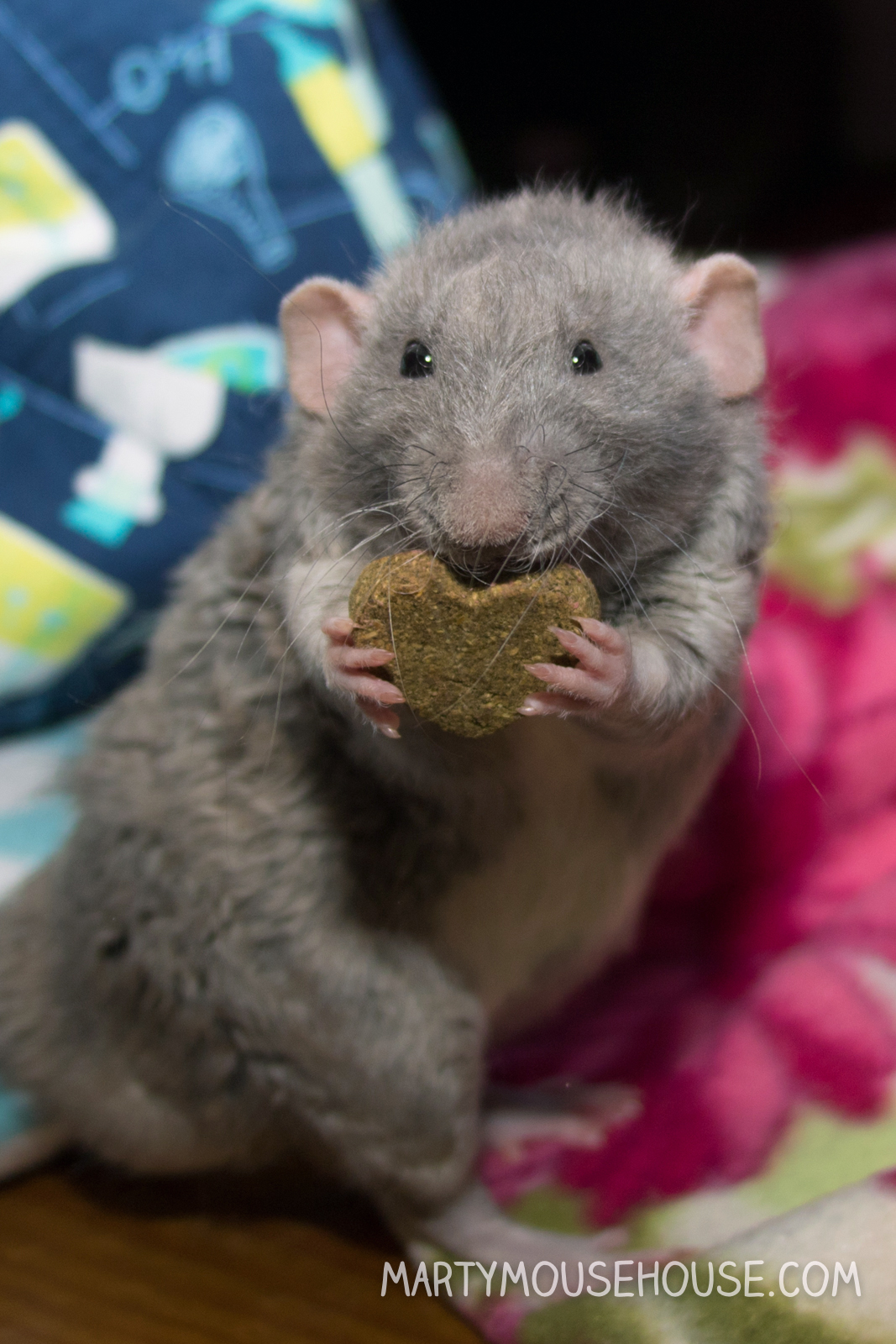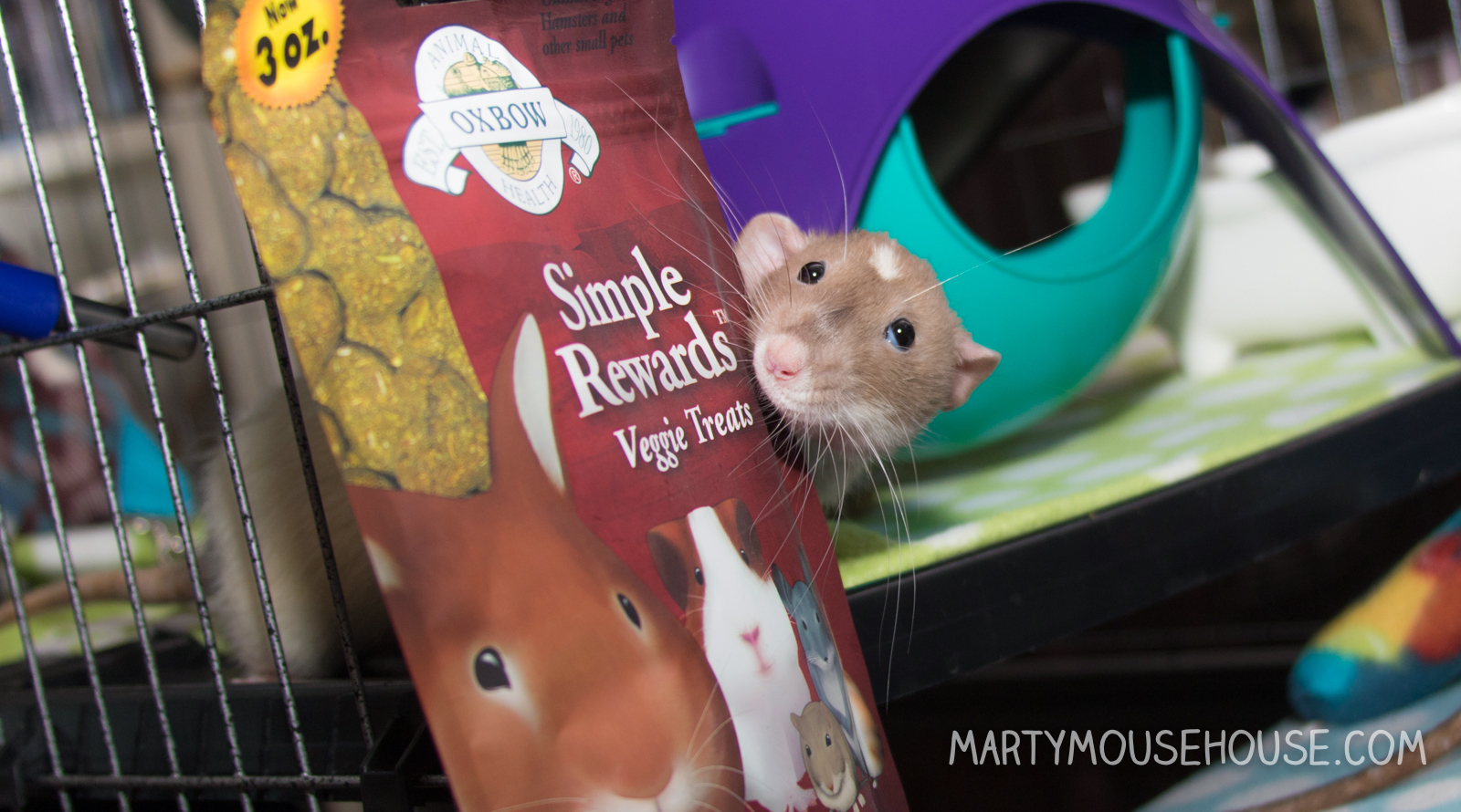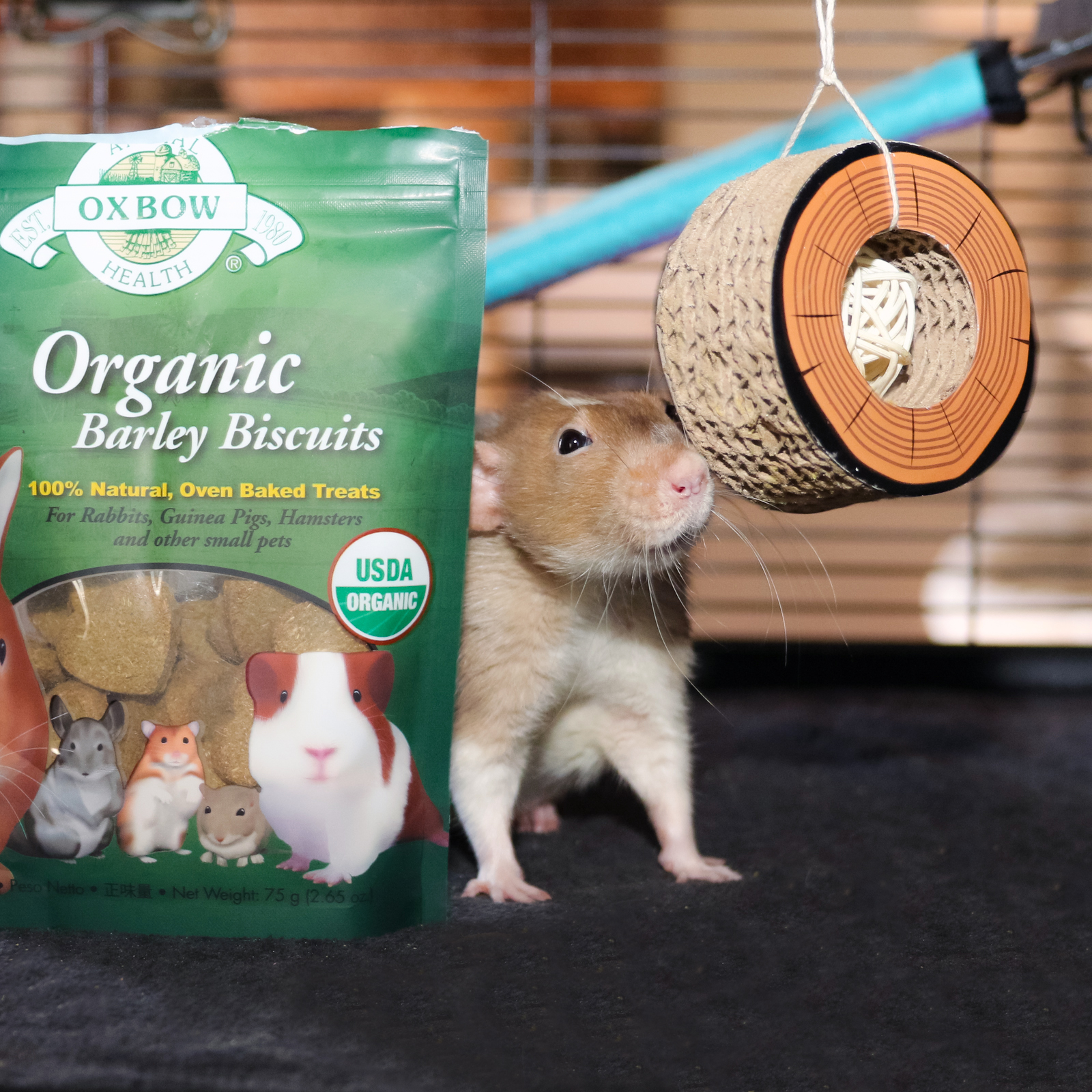Our Oxbow box is here!! We got some Presidentshul Biscuits (aka Essentials Adult Rat Food) which ob course is a staple in our house since Fibbs gabe them his offishul endorffment. We also got a small Flip & Roll toy which is fun to play wiff AND we also got some Organic Barley Biscuits that are shaped like a heart! I fink we better stop talking now so we can hab a snack…