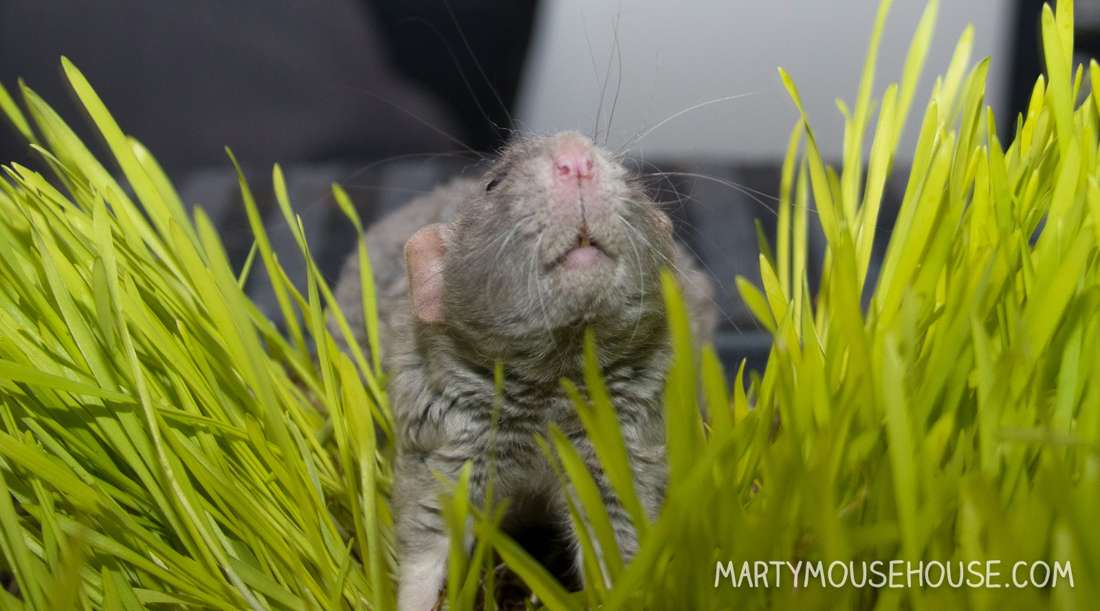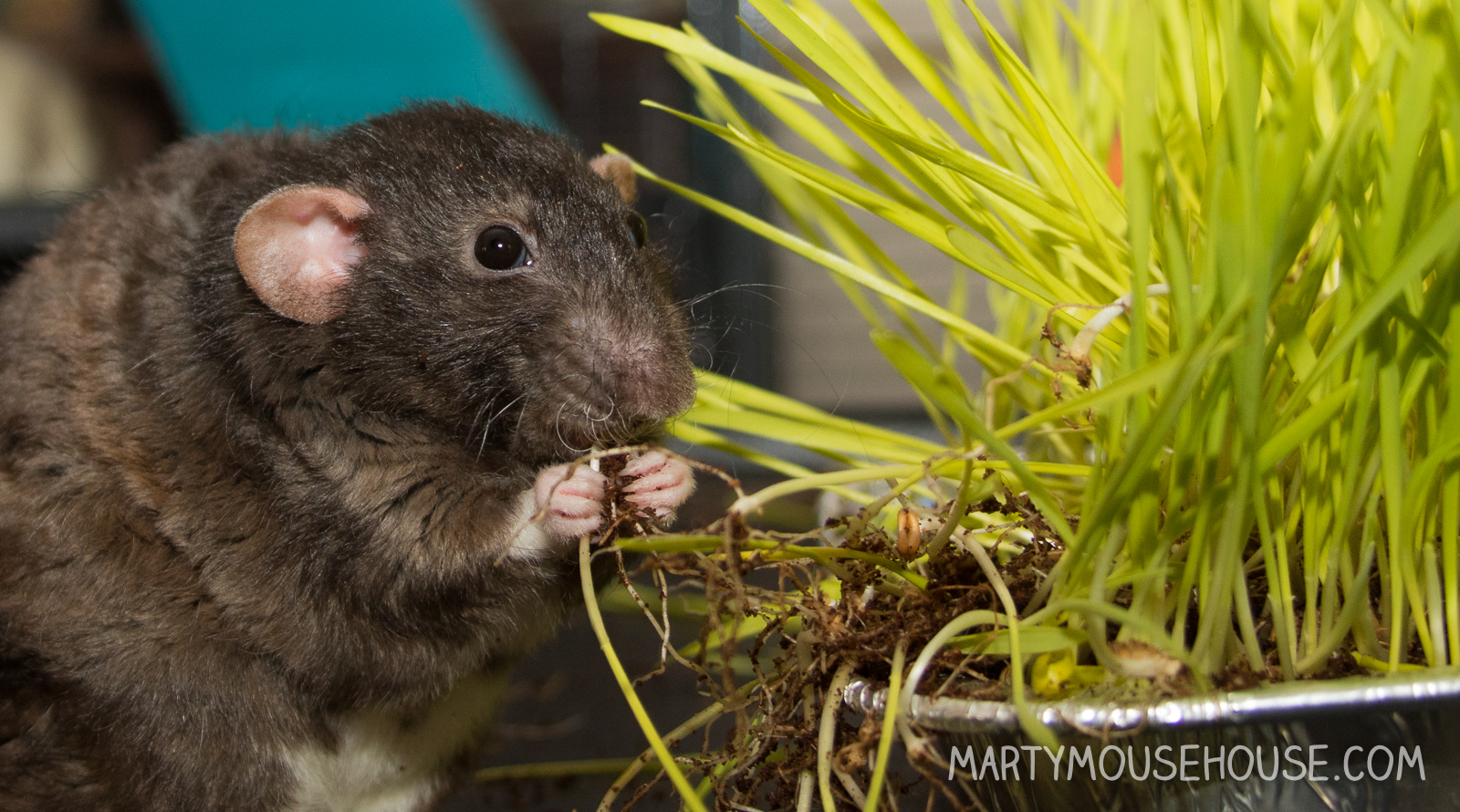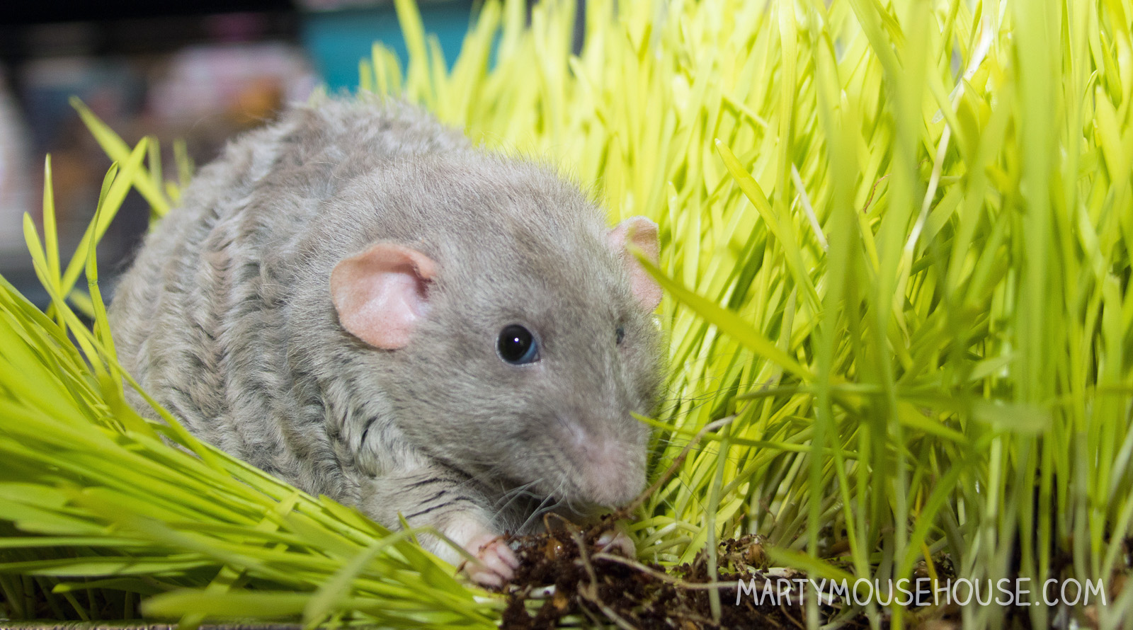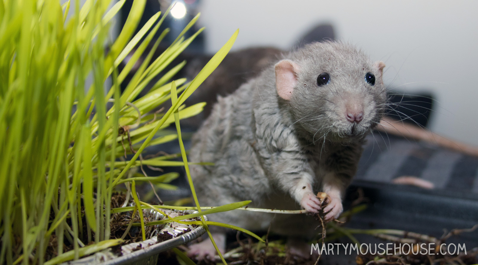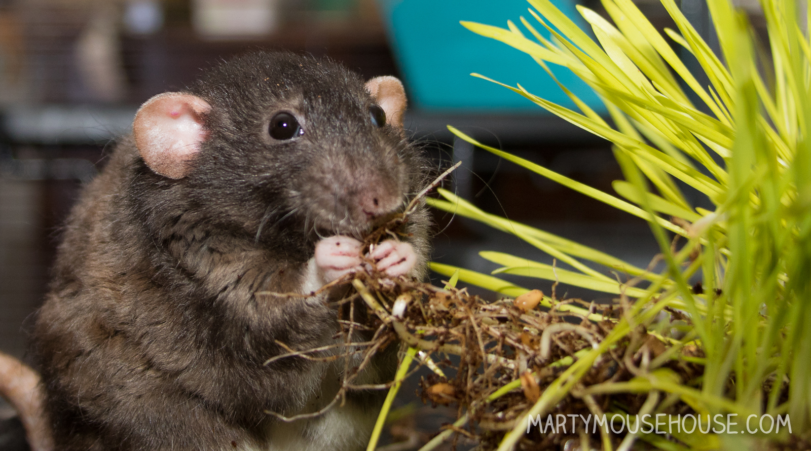 Last weekend our friend Pants at @RatsHaveFeelingsToo brought us a rooting box wiff wheat grass in it. We watered it for a few days and it grew real fast! Today we got to check it out and play wiff it…and eat stuff we dug up! It’s like we are farmers or somefing. Eben tho there was alot ob dirt, somehow we got away wiff not habbing a baff. Phew…. Fank you Pants – we had a great time wiff this!!