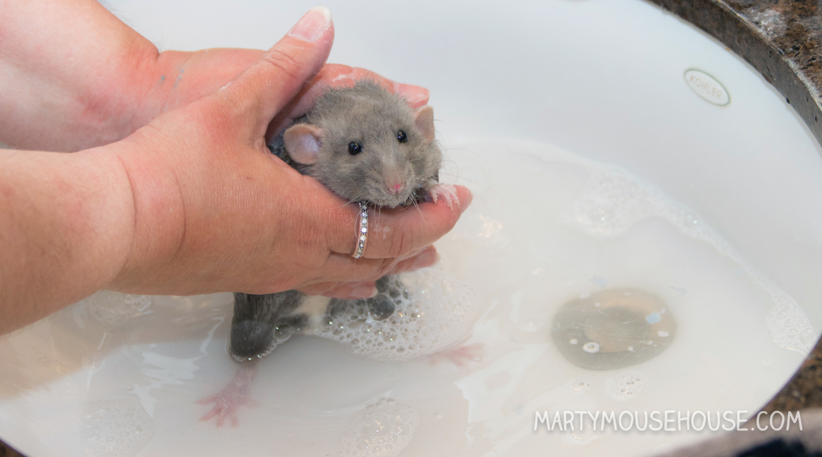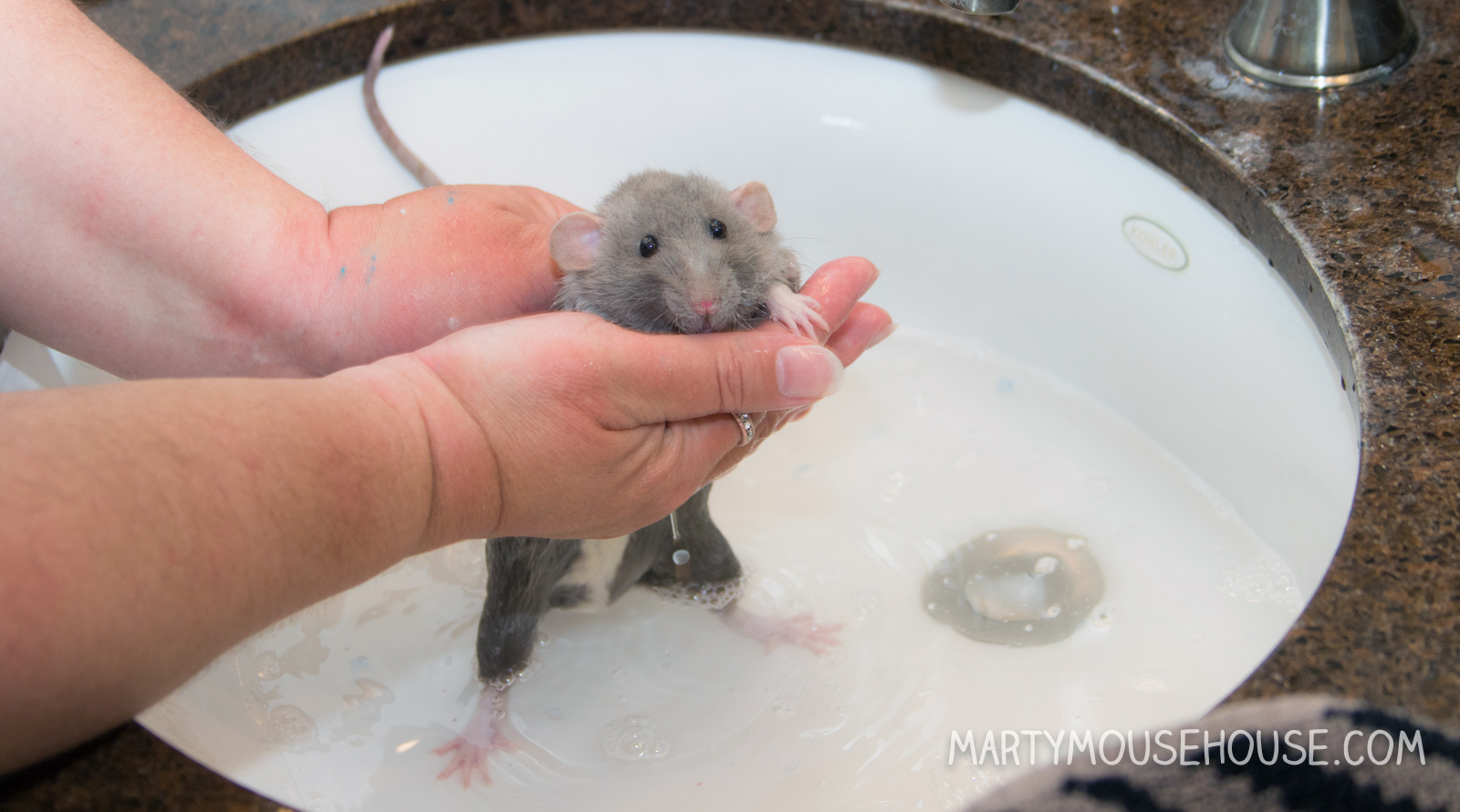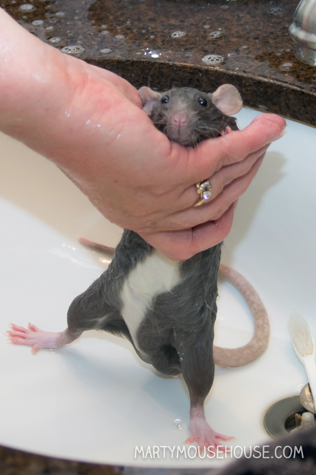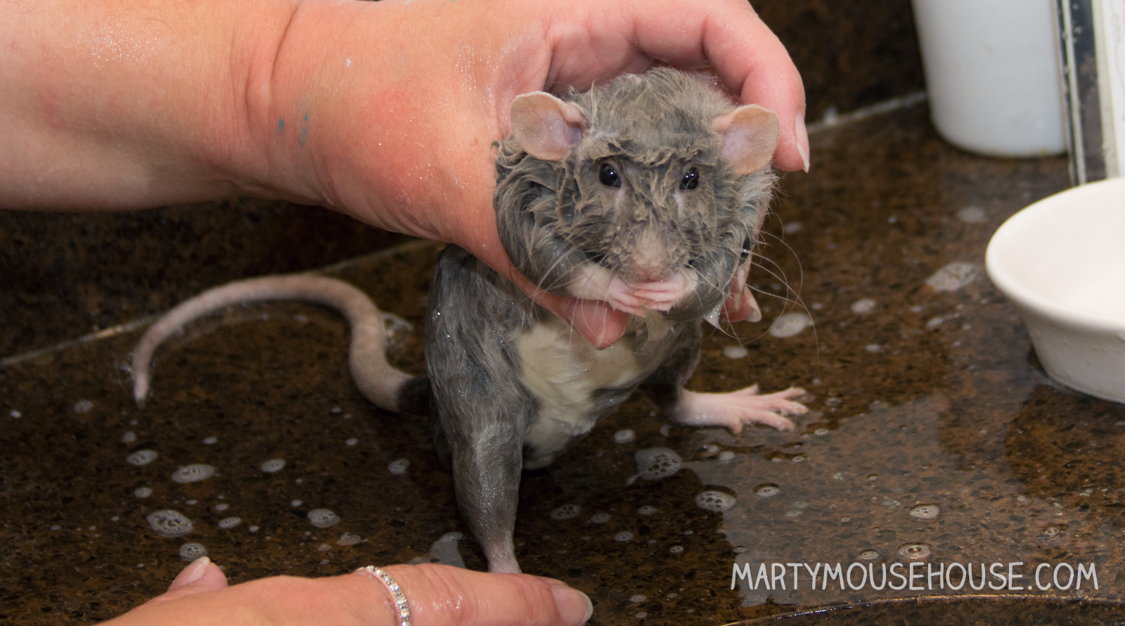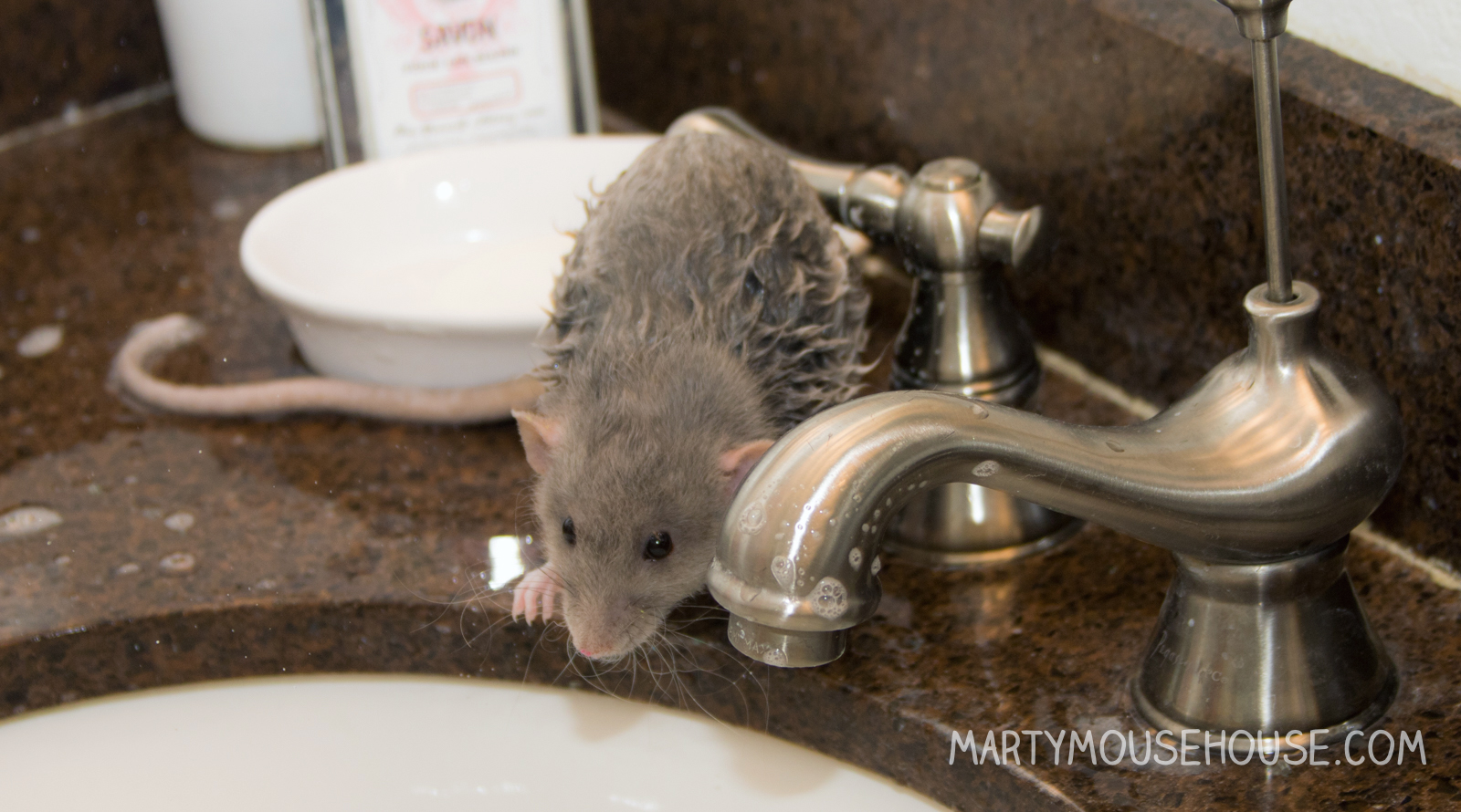 Hai you guys. I had my first baff, and to be honest, I was kind ob liking it! But then I got out for a second, and den I slipped head first back into the baff! Dat part wasn’t as fun, but I recobered pretty quick and the remainder ob the baff was nice. I got extra dry time and kisses, so it was worff it. I enjoyed arting, so if we hab to baff after it, dat’s ok. I had to take a baff anyway since after we arted we went to the royal wedding, so I had to smell good! Some people might fink I look like a drowned rat, but no one was trying to drown me, I just slipped, so don’t run on slippery counters. Good fing I didn’t hab scissors. – Dis Augie