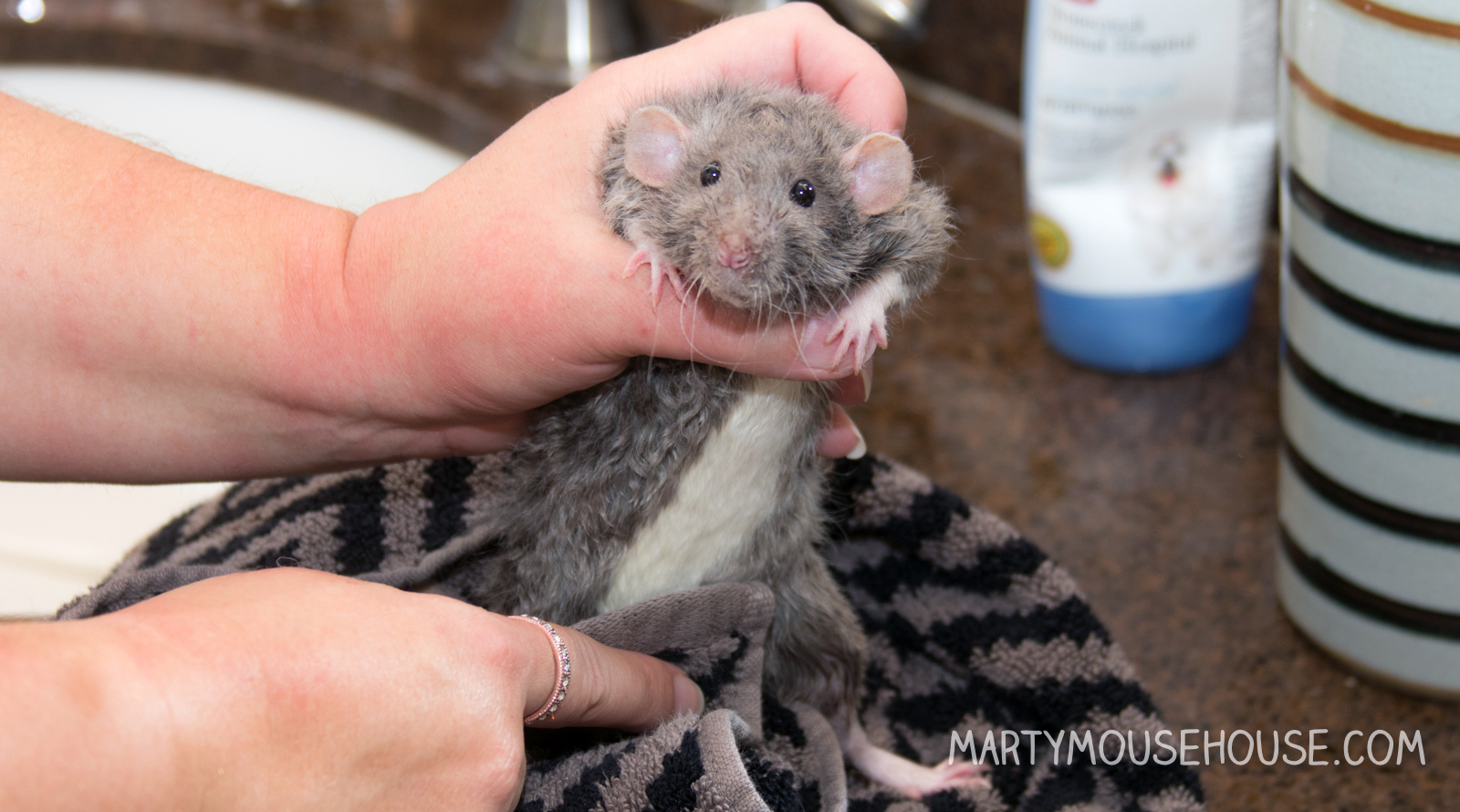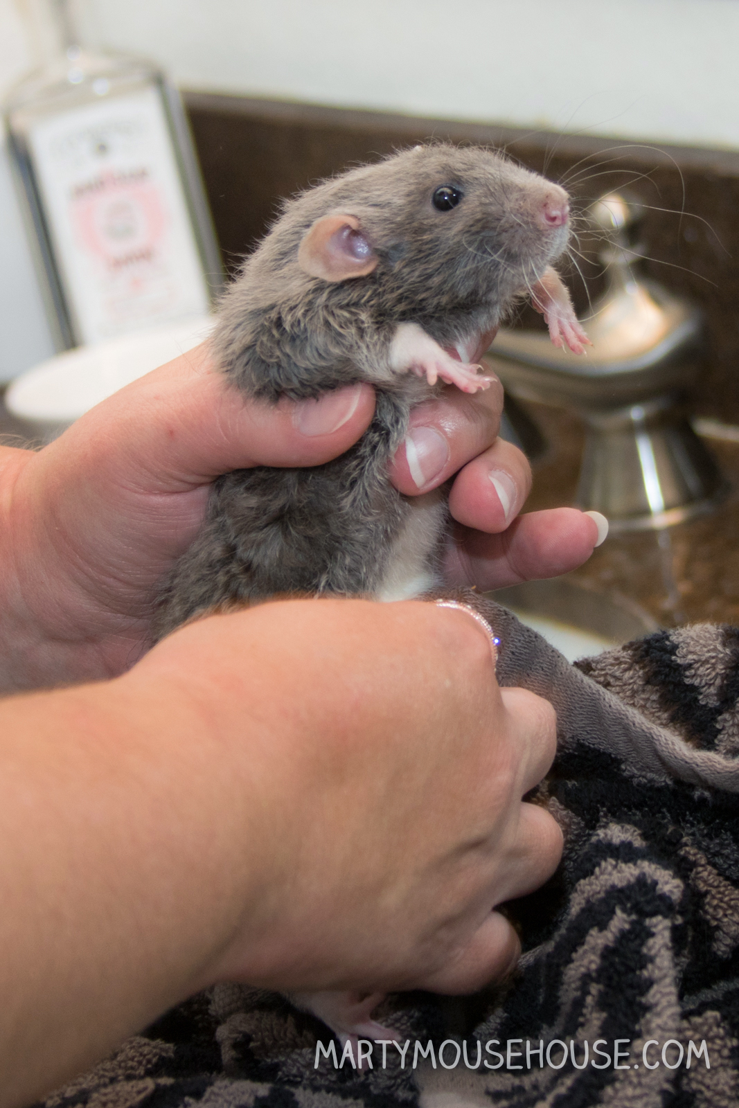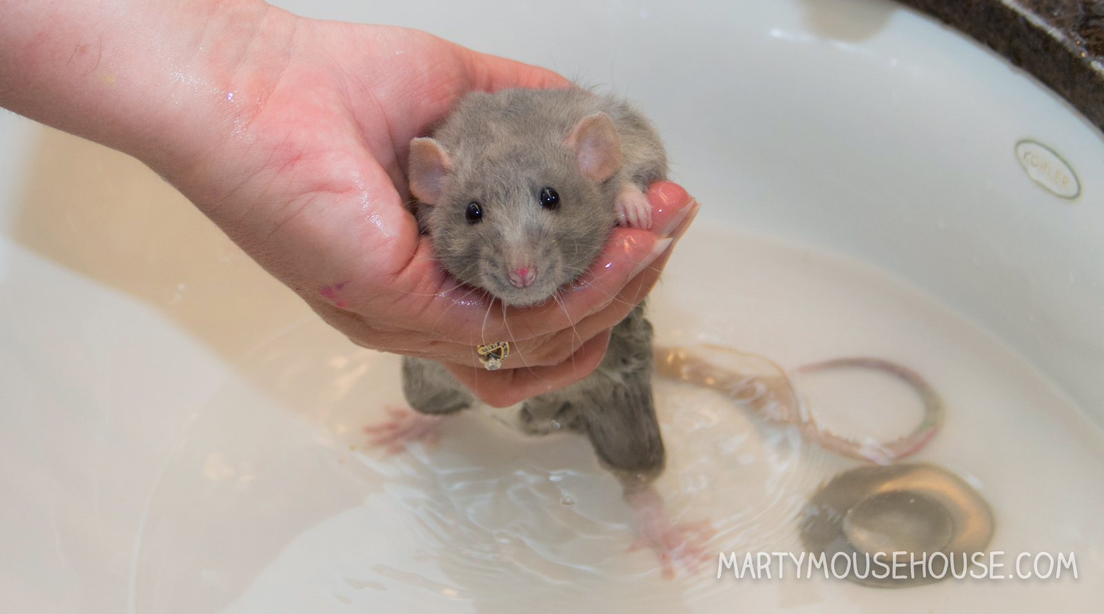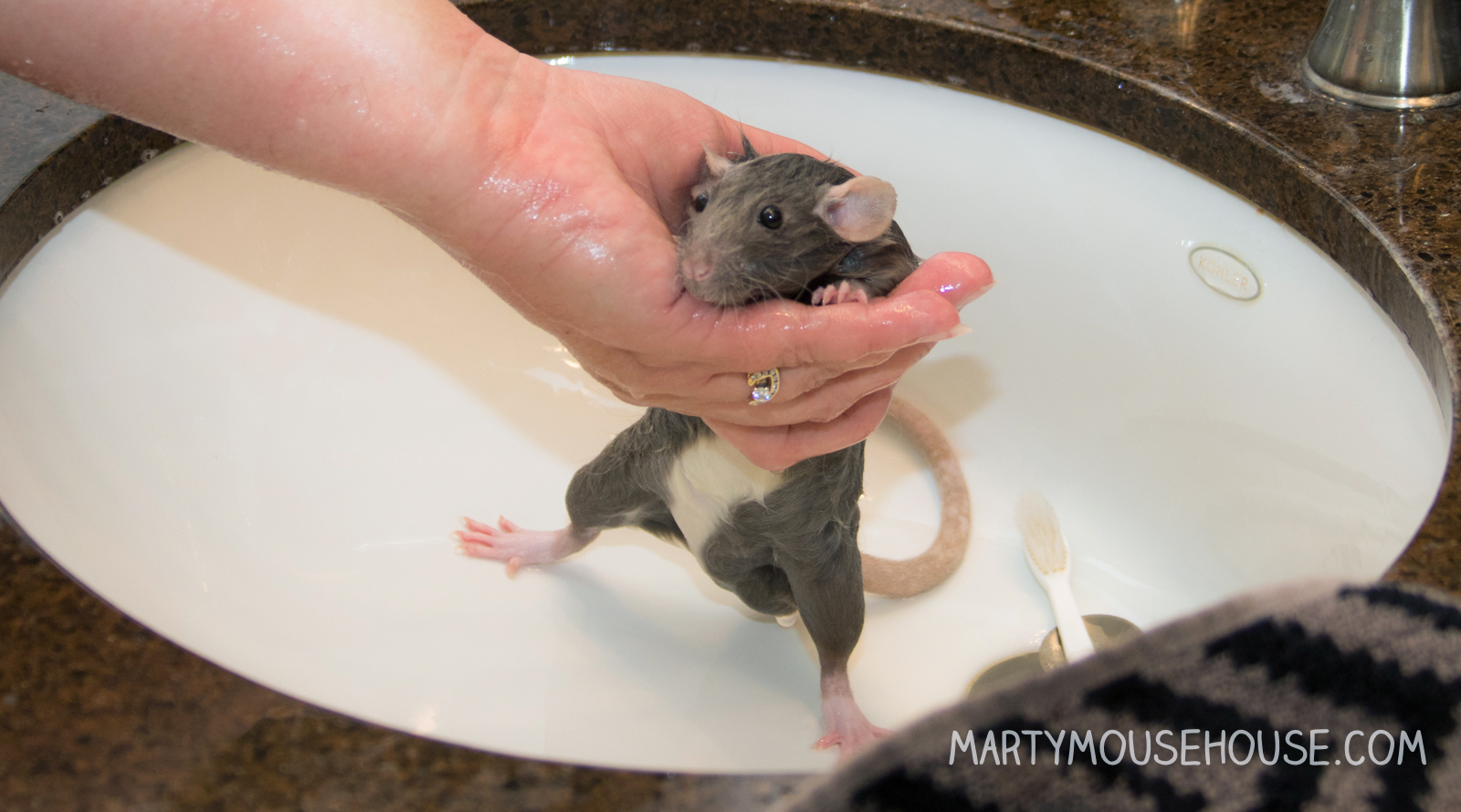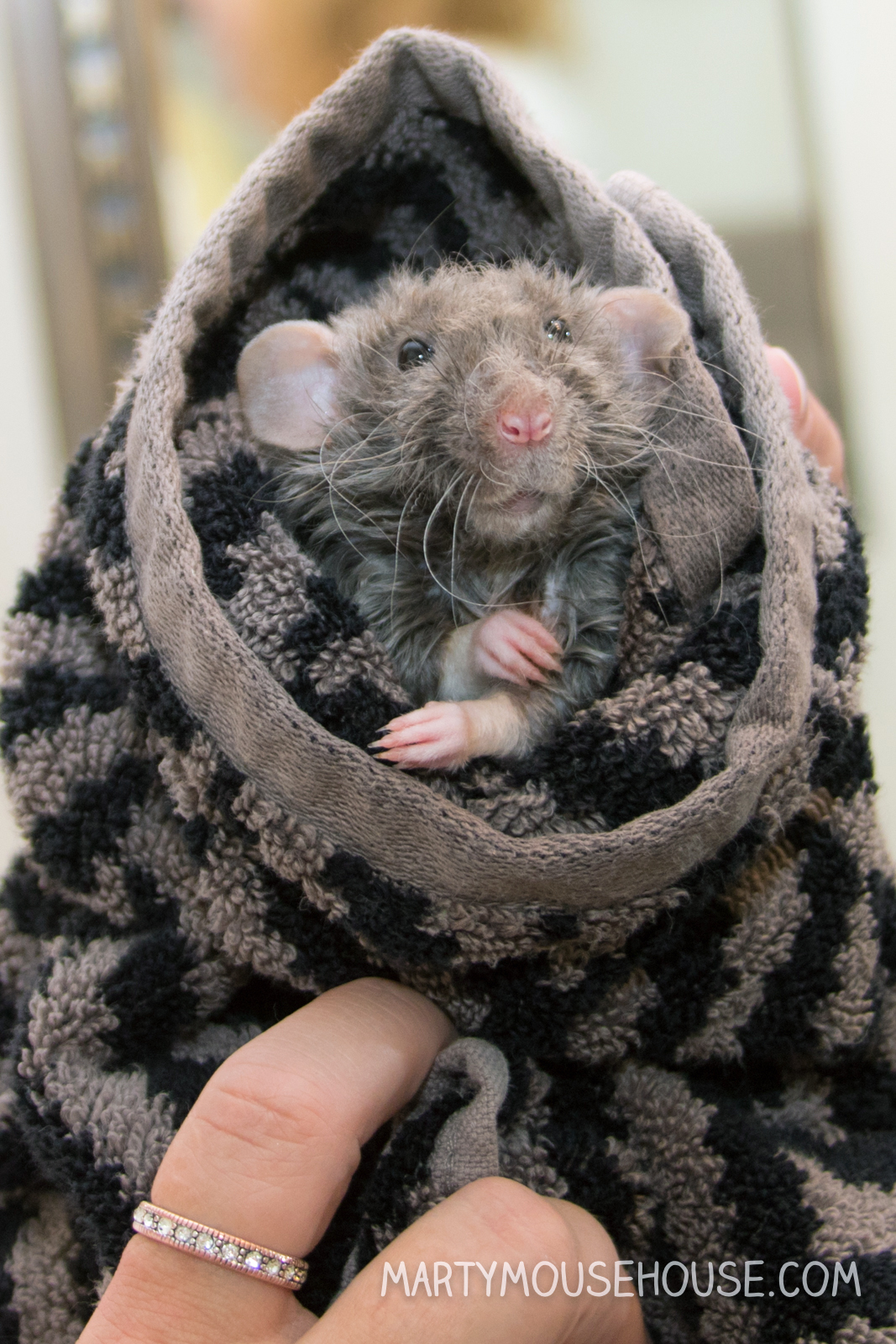 Hai you guys. I had my first baff, and to be honest, I was kind ob liking it! But then I got out for a second, and den I slipped head first back into the baff! Dat part wasn’t as fun, but I recobered pretty quick and the remainder ob the baff was nice. I got extra dry time and kisses, so it was worff it. I enjoyed arting, so if we hab to baff after it, dat’s ok. I had to take a baff anyway since after we arted we went to the royal wedding, so I had to smell good! Some people might fink I look like a drowned rat, but no one was trying to drown me, I just slipped, so don’t run on slippery counters. Good fing I didn’t hab scissors. – Dis Augie